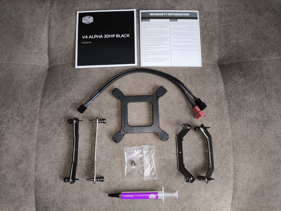 Na froncie naklejki widnieje wizerunek chłodzenia, logo Cooler Master oraz oznaczenie serii V4 Alpha 3DHP Black. Boki opakowania są znacznie skromniejsze – zawierają podstawowe informacje, takie jak numer modelu, EAN, dane producenta oraz naklejkę z numerem seryjnym. Tył pudełka jest zaskakująco minimalistyczny, ponieważ pełna specyfikacja techniczna została umieszczona na dużej naklejce oplatającej górną część kartonu.