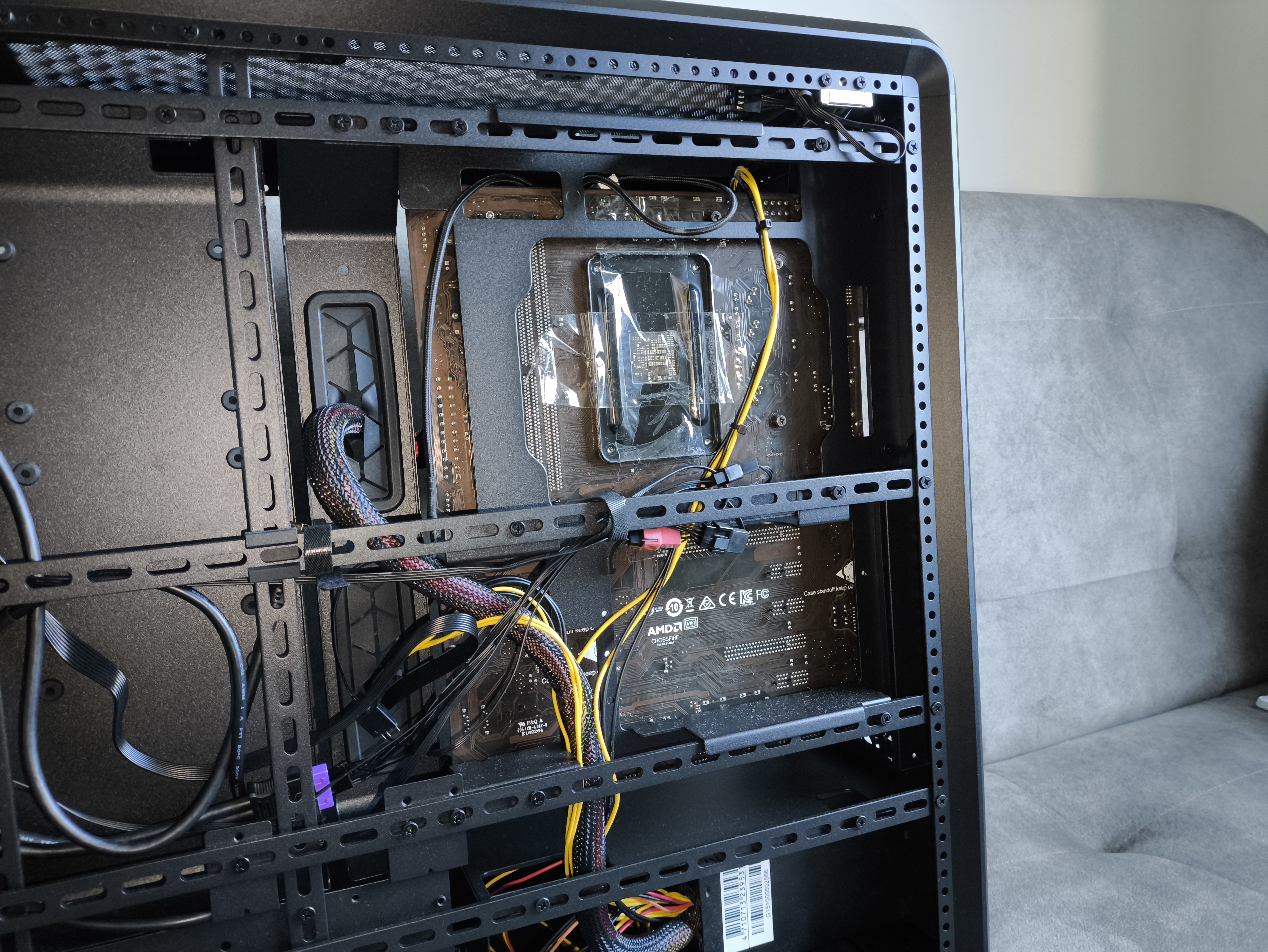 Strona serwisowa obudowy Cooler Master MasterFrame 600 w pełni uzasadnia obecność słowa „frame” w nazwie modelu. Najbardziej rzuca się tu w oczy gęsta siatka perforowanych belek stalowych, tworzących swoiste „rusztowanie” konstrukcji.