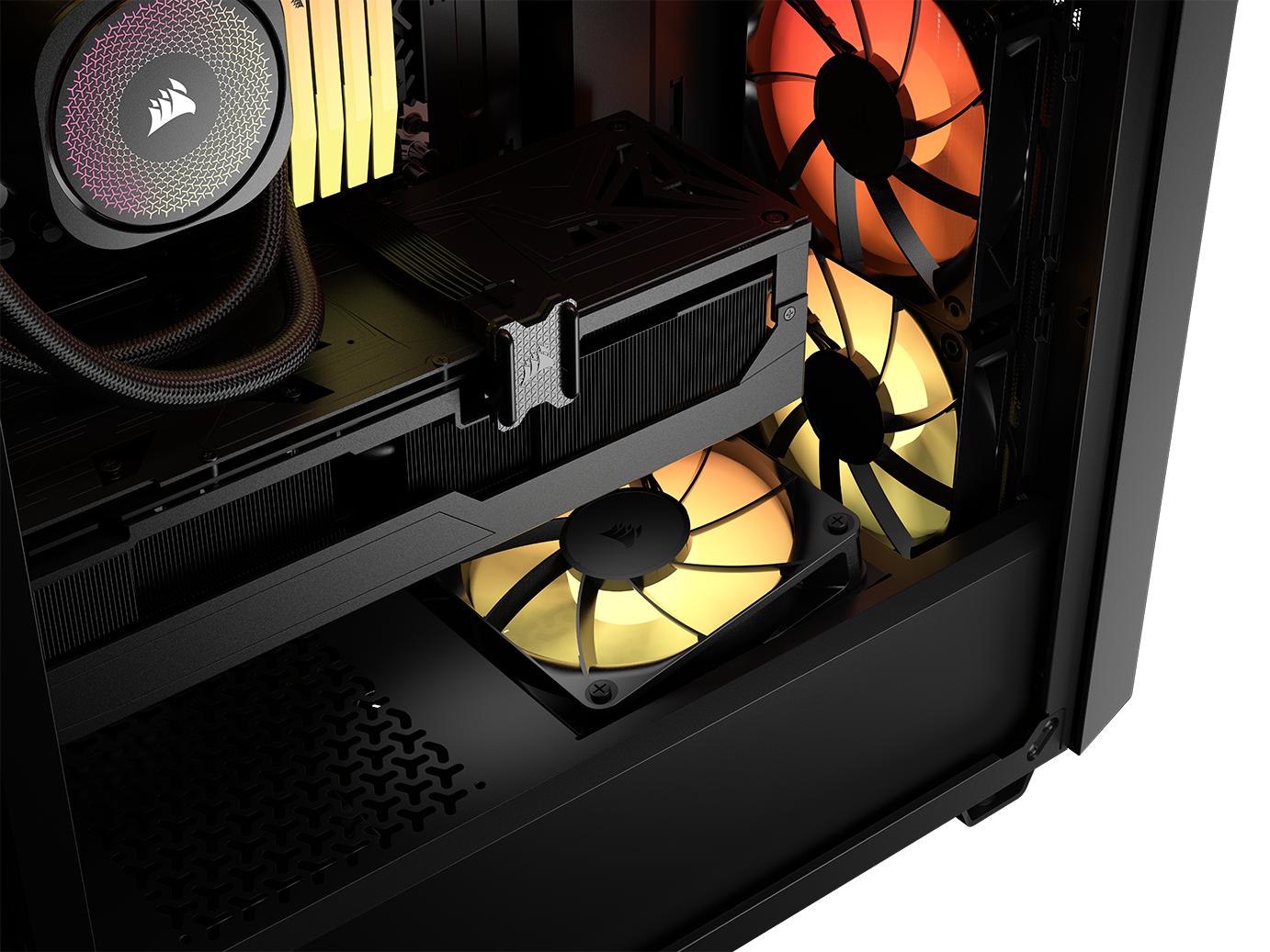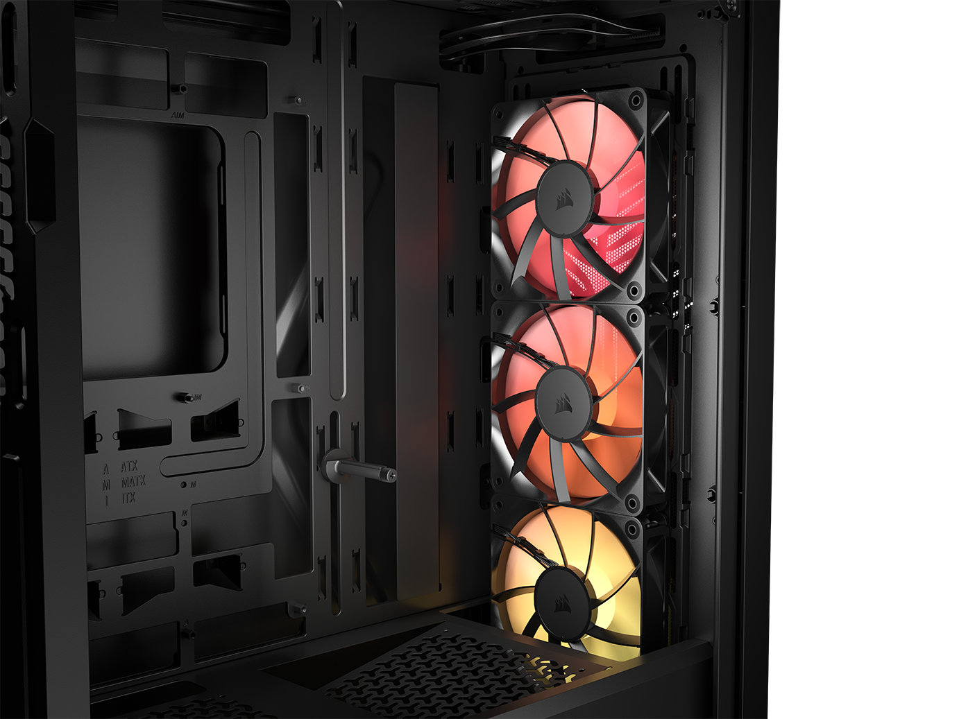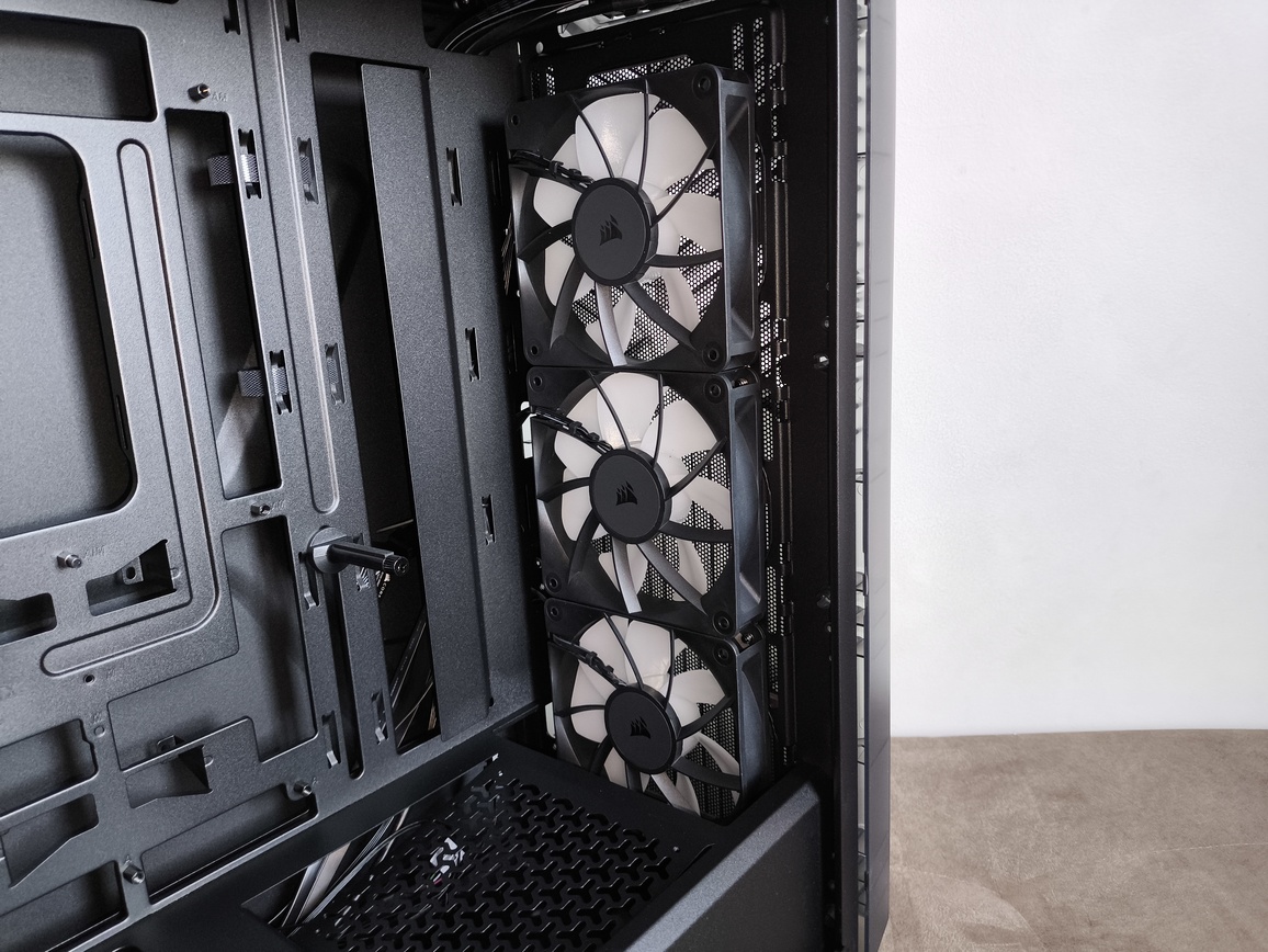 W obudowie Corsair Frame 3200D RS ARGB fabrycznie zamontowano trzy wentylatory Corsair RS120 ARGB. W testowanej wersji zestaw ten obejmuje trzy jednostki 120 mm umieszczone z przodu (ewentualnie dwa 140 mm – w zależności od konfiguracji i wersji montażowej), natomiast dodatkowe trzy wentylatory 120 mm (lub 2 x 140 mm) mogą zostać zamontowane na górze kolejne dwa – na piwnicy zasilacza no i na koniec – jeden 120 mm z tyłu.