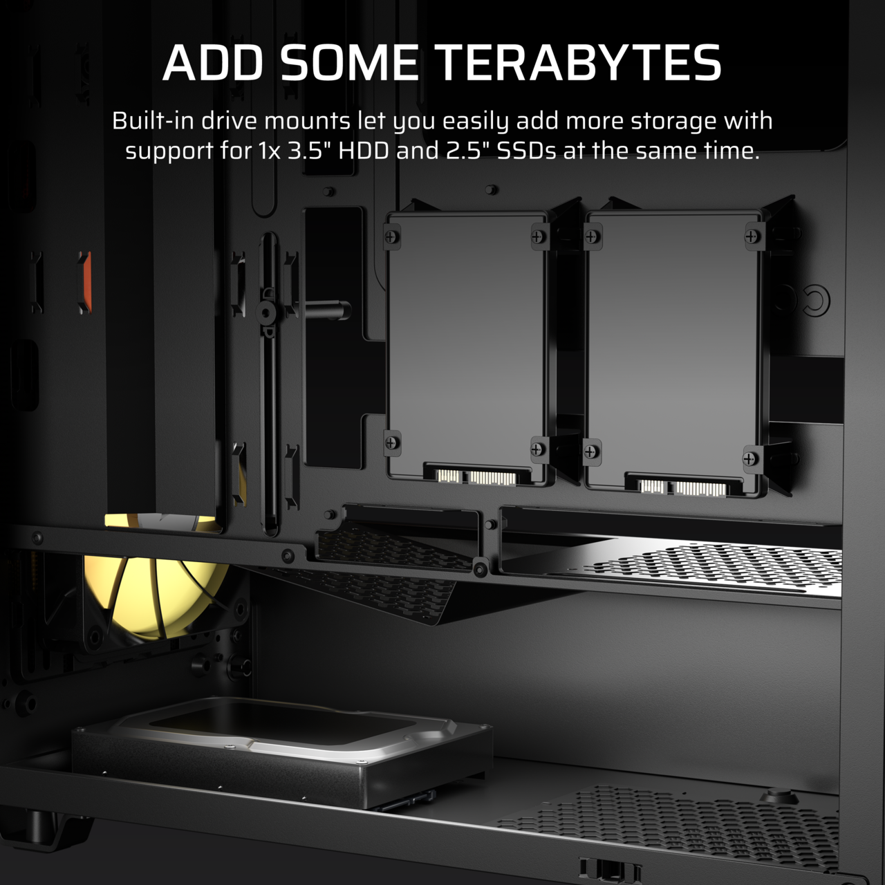 W odpowiednich miejscach rozmieszczono przepusty prowadzące do przestrzeni za płytą główną, co ułatwia estetyczne ukrycie okablowania i pozwala zachować porządek wewnątrz obudowy. Producent zastosował również pewne kompromisy w zakresie obsługi nośników danych – na tyle tacki można zamontować maksymalnie dwa dyski SSD w formacie 2,5 cala. W praktyce dla wielu użytkowników nie będzie to ograniczenie, ponieważ coraz częściej korzysta się z dysków NVMe PCIe montowanych bezpośrednio na płycie głównej.