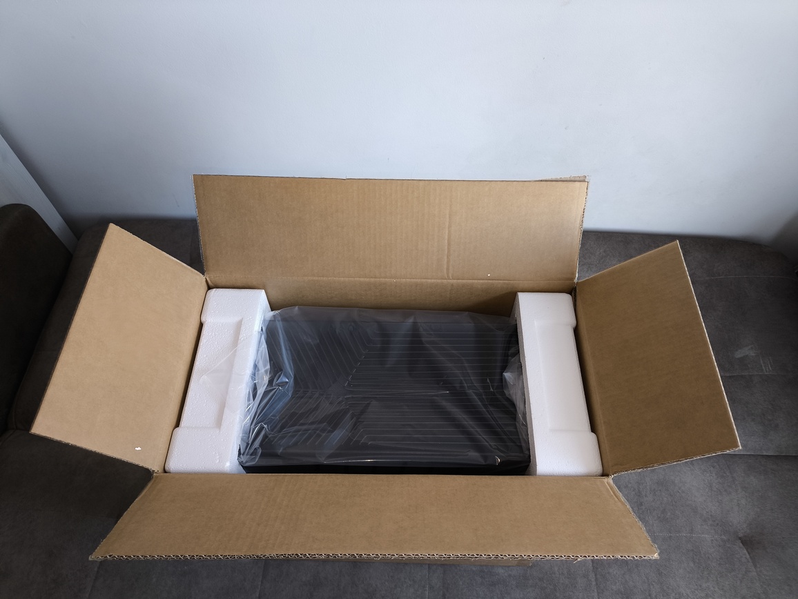 Wnętrze opakowania zostało dobrze zabezpieczone. Konstrukcja jest unieruchomiona za pomocą grubych, piankowych form ochronnych, które skutecznie minimalizują ryzyko uszkodzeń podczas transportu. Ma to szczególne znaczenie w przypadku tej konstrukcji, która wykorzystuje panele ze szkła.