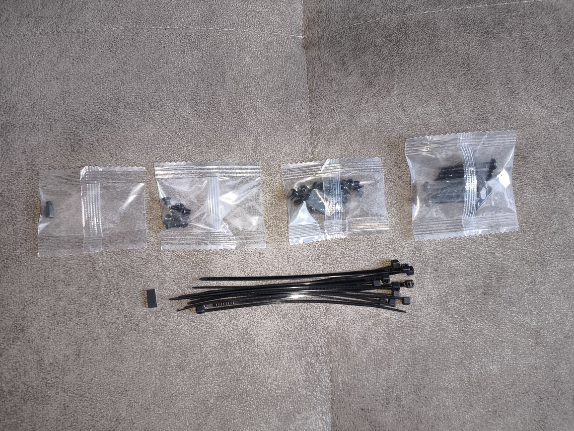W zestawie znajdziemy standardowy komplet akcesoriów montażowych, w tym śrubki, dystanse oraz kilka opasek zaciskowych do zarządzania okablowaniem. Producent dorzuca również podstawową dokumentację.