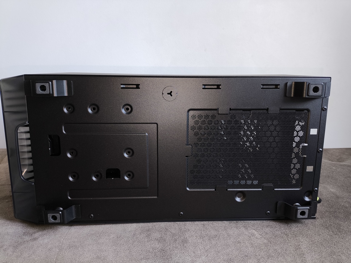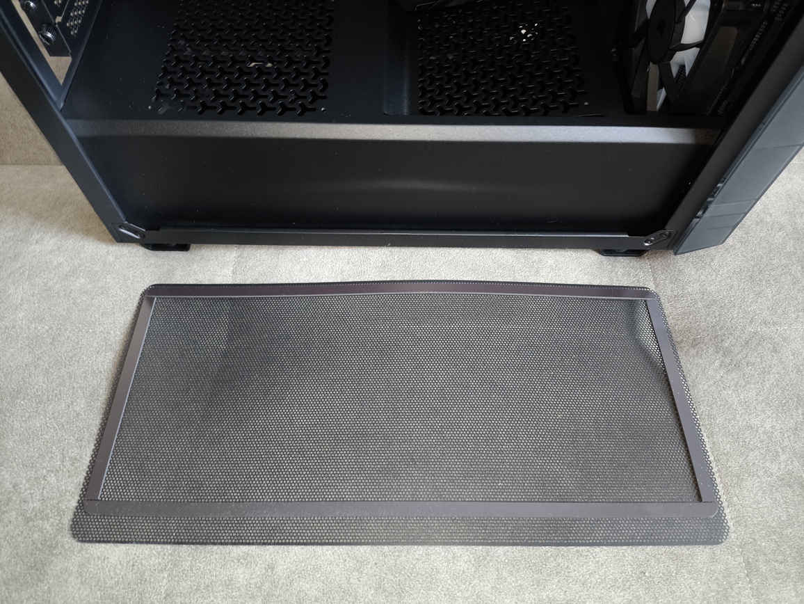 Na spodzie obudowy znalazł się również filtr przeciwkurzowy, montowany w bardzo prosty sposób – poprzez wsunięcie go w dedykowane wypustki. Spełnia on swoje podstawowe zadanie, czyli zabezpiecza wentylator zasilacza przed większymi zanieczyszczeniami, jednak zastosowane rozwiązanie nie należy do najbardziej wygodnych ani zaawansowanych.