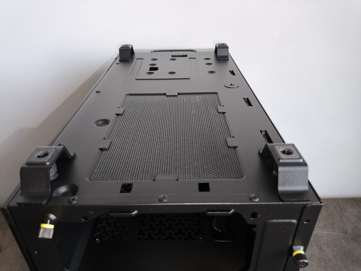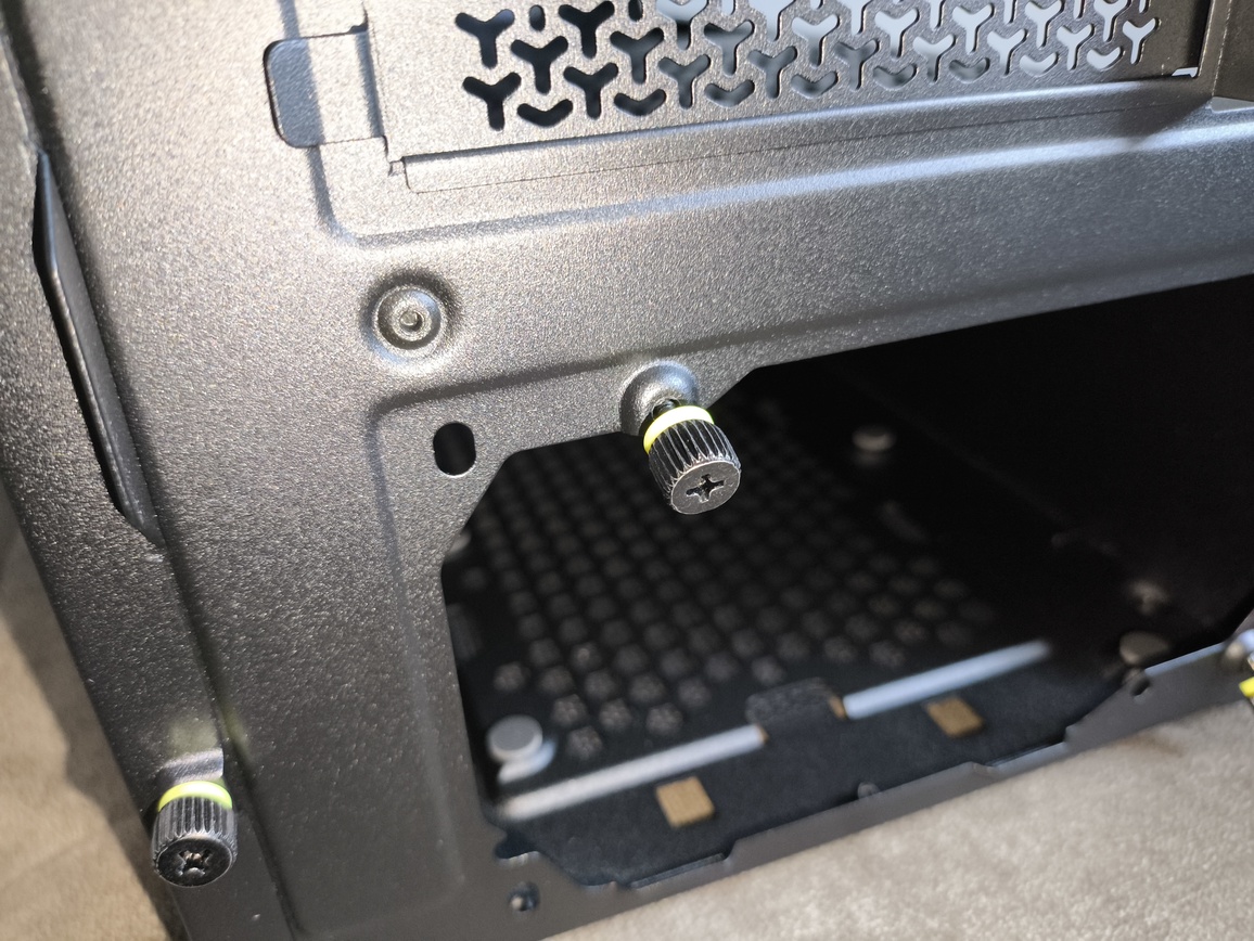 Obudowa Corsair Frame 3200D opiera się na czterech, średniej wielkości, wkręcanych metalowych nóżkach o dość nietypowej, wyróżniającej się stylistyce – tj. odwróconego trapezu. To rozwiązanie nie jest dziś szczególnie często spotykane, a już na pewno nie w tej formie wizualnej, co zdecydowanie działa na plus pod względem estetyki. Nóżki unoszą konstrukcję na kilka centymetrów ponad powierzchnię, zapewniając odpowiednią przestrzeń dla zasysania powietrza od spodu.