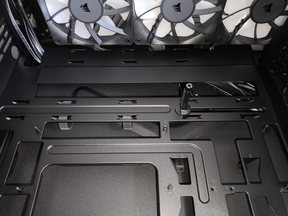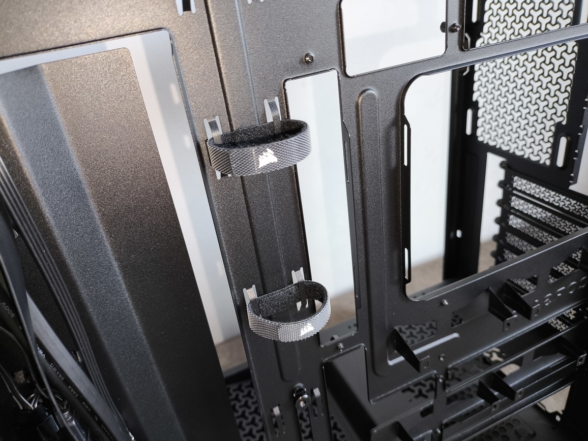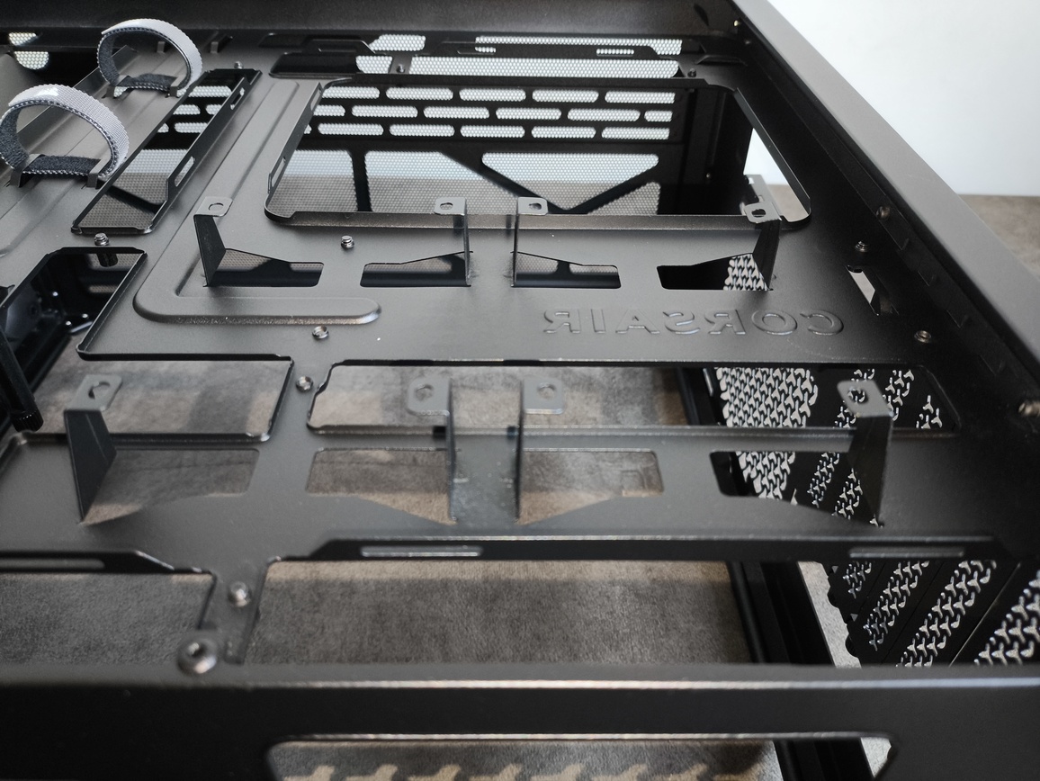 W obrębie tacki montażowej w obudowie Corsair Frame 3200D RS ARGB wyróżnić można kilka kluczowych elementów poprawiających organizację okablowania: