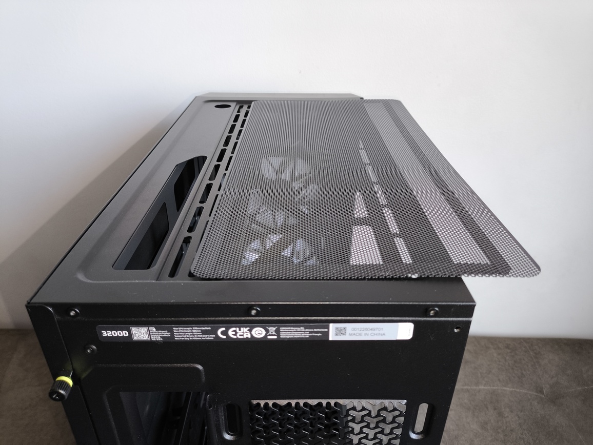 Na górze obudowy Corsair Frame 3200D znajduje się klasyczny wręcz duży, magnetyczny filtr przeciwkurzowy, który trzyma się na magnesach rozmieszczonych wzdłuż całej krawędzi panelu. Jego demontaż jest bardzo prosty i szybki – wystarczy unieść go do góry, bez użycia jakichkolwiek narzędzi.