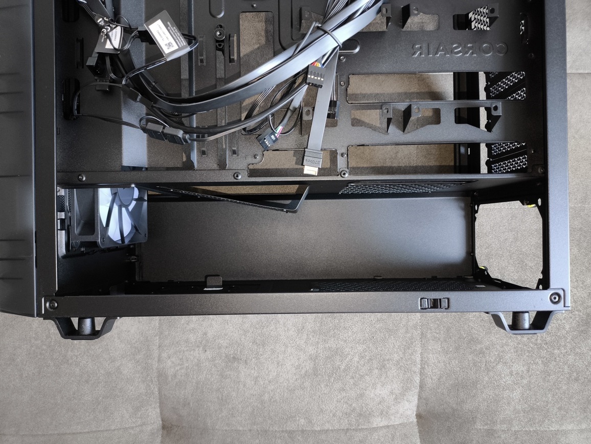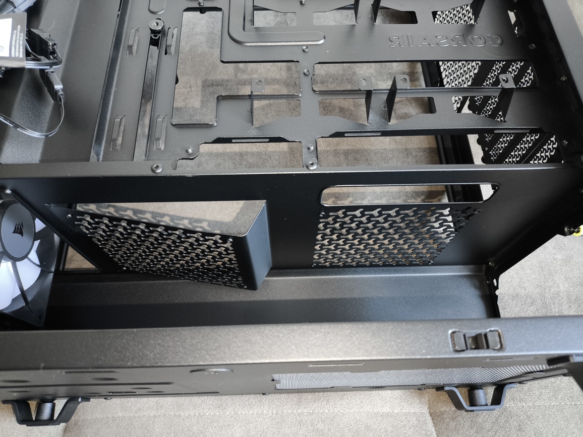 Sekcja zasilacza w obudowie Corsair Frame 3200D RS ARGB została wydzielona w formie pełnego tunelu, który skutecznie izoluje PSU wraz z całym okablowaniem od głównej komory. Takie rozwiązanie znacząco poprawia estetykę wnętrza oraz ułatwia utrzymanie porządku w prowadzeniu przewodów. Sam otwór wentylacyjny pod zasilaczem jest odpowiednio duży, co zapewnia swobodny dopływ chłodnego powietrza.