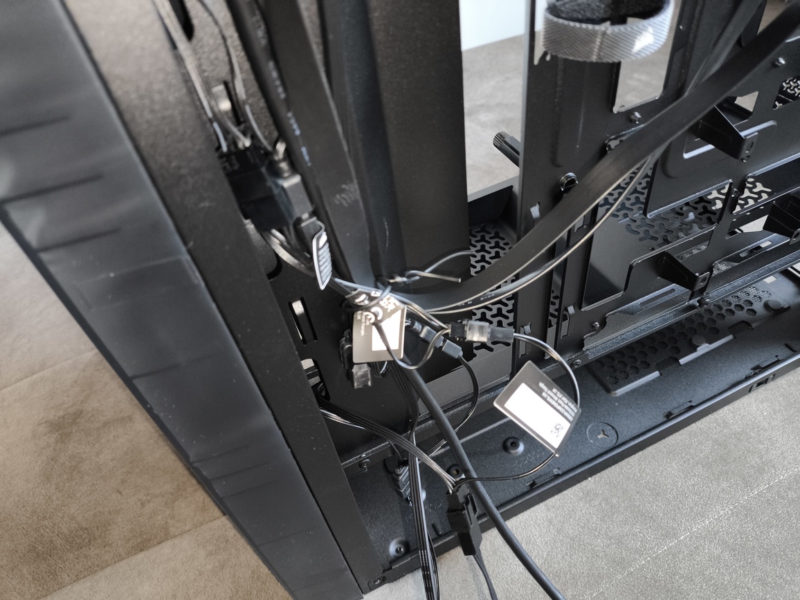 Pod względem zarządzania kablami obudowa oferuje rozsądny zestaw możliwości, jednak wymaga od użytkownika pewnej dozy kreatywności. Brakuje tu rozbudowanych prowadnic czy dedykowanych kanałów, dlatego głównym narzędziem organizacji są opaski zaciskowe oraz ręczne układanie przewodów.