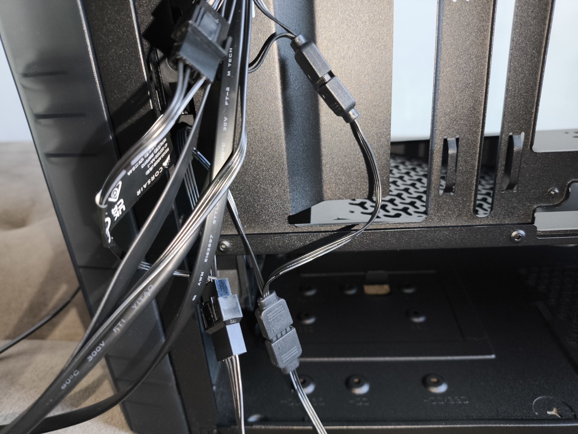 Wentylatory łączymy szeregowo, sterując nimi za pomocą pojedynczego 4-pinowego złącza PWM i jednego złącza ARGB +5V na płycie głównej.