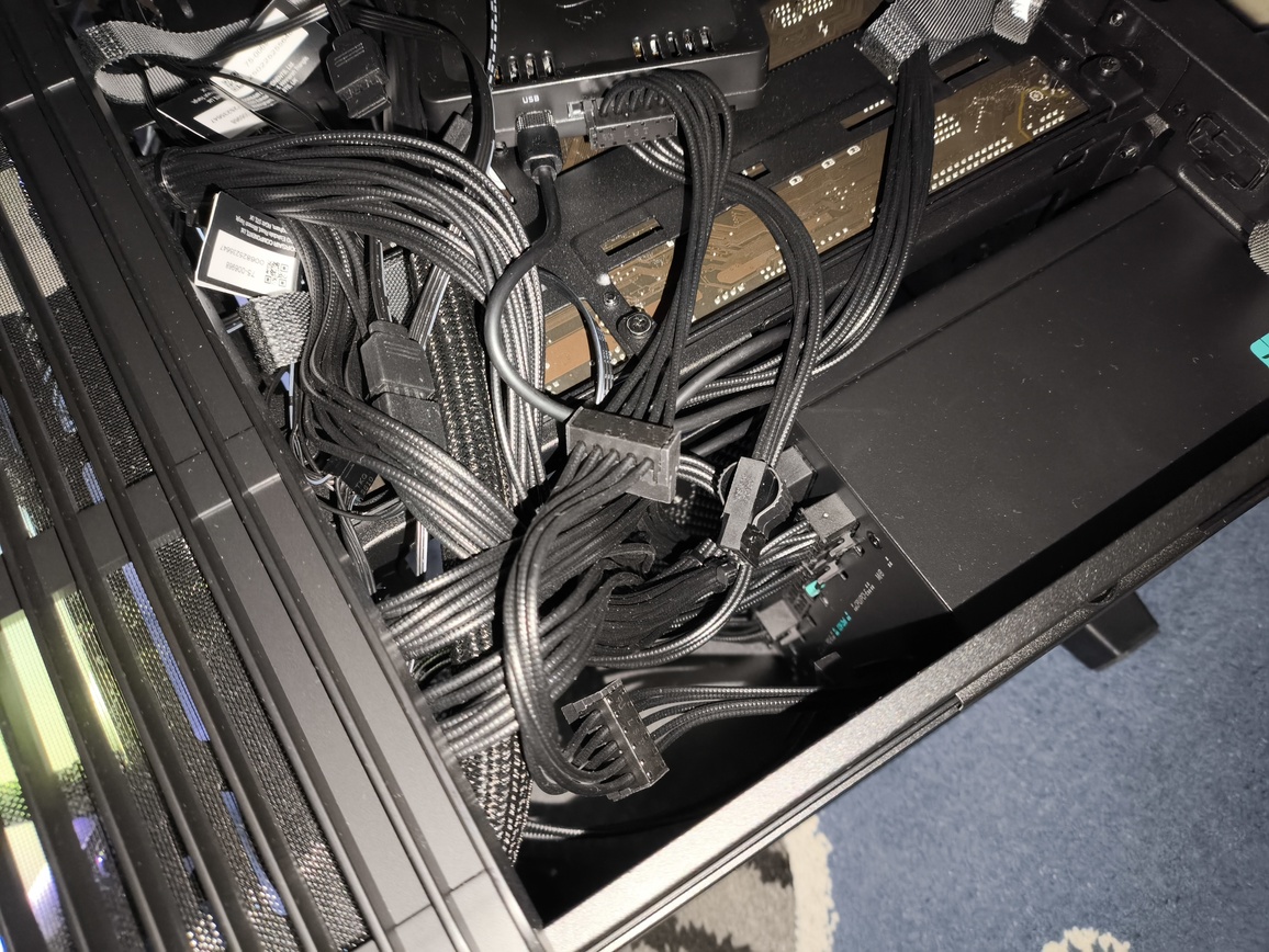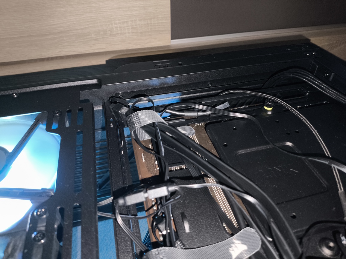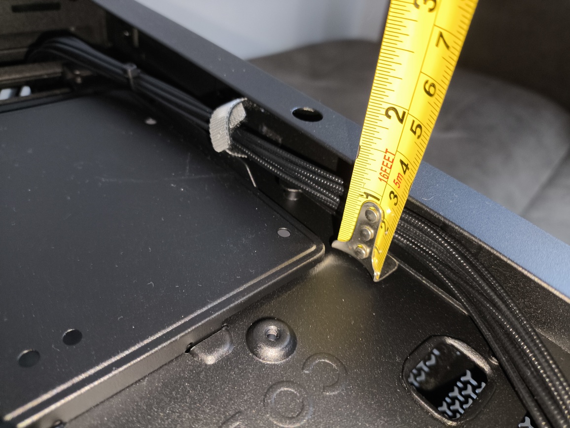 Podsumowując. Przestrzeń jest wystarczająca dla konfiguracji ATX z klasycznym okablowaniem, choć przy bardzo grubych wiązkach — szczególnie 24-pin ATX — panel potrafi zrzucić się samoczynnie, jeśli kable nie są ułożone idealnie płasko. To efekt połączenia ograniczonej sztywności bocznego panelu oraz dość delikatnych pinów montażowych.