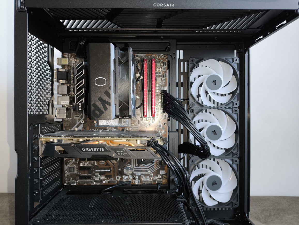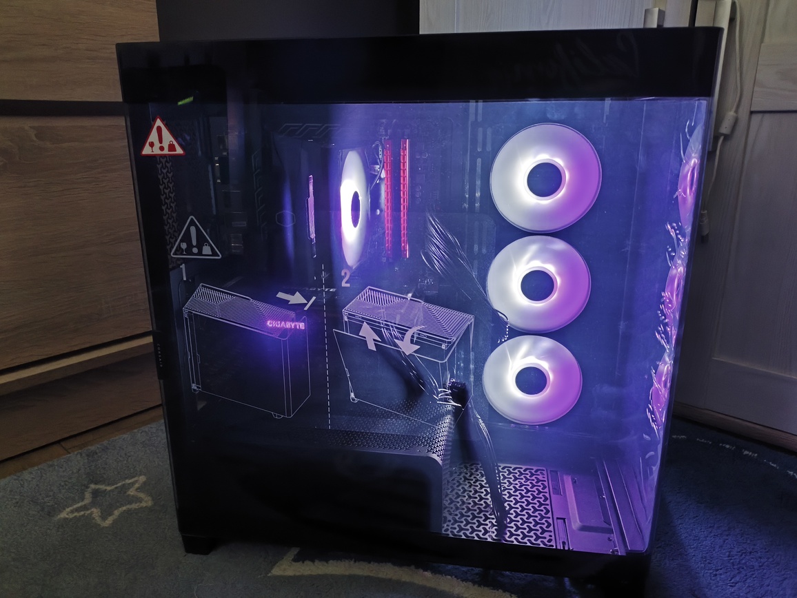 Montaż w obudowie Corsair Frame 4500X RS-R ARGB zasadniczo jest bardzo wygodny dzięki szerokiemu wnętrzu, klarownemu rozplanowaniu i dużej ilości miejsca na okablowanie. Duża komora główna bez trudu mieści chłodzenia AiO 360 mm zarówno na górze, jak i z 'przodu’ (jak oczywiście zdemontujemy fabryczne wentylatory do tego celu), a karty graficzne mogą mieć długość do 460 mm i nie kolidują z wentylatorami ani kablami. Wysokie chłodzenia procesora też nie będą kolidowały z panelem bocznym bowiem 185 mm to wystarczająco dużo miejsca na to.