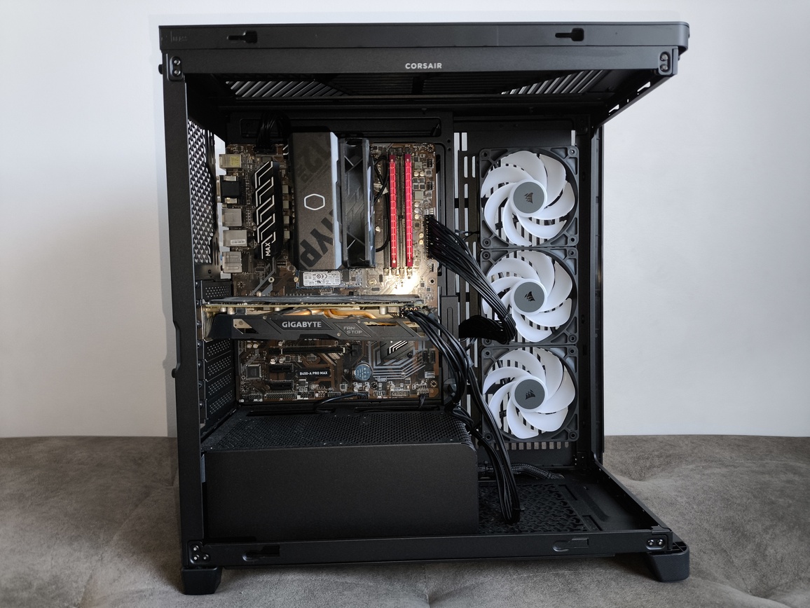 Corsair zastosował tutaj rozsądną filozofię montażu – użytkownik nie musi wykonywać trudnych manewrów nawet przy większych radiatorach. Tacka daje dobrą dostępność, a przelotki kablowe znajdują się dokładnie tam, gdzie są potrzebne.
