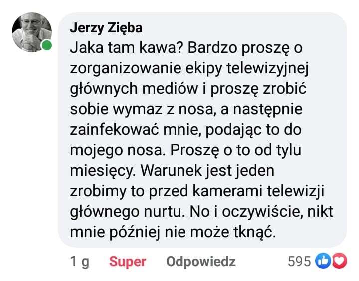 - Jerzego Zięby z kolei nie trzeba nikomu przedstawiać. W ostatnich dniach najwyraźniej ma problemy z określeniem swojego „zawodu”. Raz podaje w Internecie metody leczenia COVID-u, raz jest publicystą, raz dziennikarzem… Pewnym jest, że jest magistrem inżynierem Wydziału Maszyn Górniczych i Hutniczych Akademii Górniczo-Hutniczej w Krakowie i to tyle w temacie jego wykształcenia medycznego.