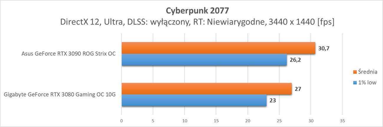 Cyberpunk 2077 pokazuje ogromne wymagania już w rozdzielczości 3440 x 1440 px. Bez RT czy DLSS do płynnej rozgrywki wymagany jest RTX 3080. Po włączeniu RT z ustawieniami Niewiarygodne żadna z kart nie zagwarantuje płynnej rozgrywki. Po dodaniu do tego DLSS RTX 3090 notuje średnio 55 fps – do idealnej wartości trochę brakuje. Jednakże jeśli wystarczy Wam 30 fps to jeszcze dacie rade uzyskać płynną rozgrywkę przy najwydajniejszych kartach.