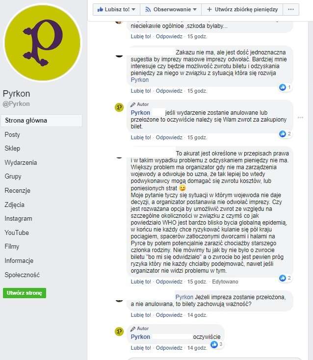 Na stronie wydarzenia na Facebooku możemy przeczytać zapewnienia, że Organizatorzy mają plan awaryjny i pracują nad różnymi rozwiązaniami, jednak nadal nie ma żadnych konkretów. Postanowiłam więc napisać bezpośrednio do Organizatorów z prośbą o ustosunkowanie się do wydanego przez premiera zakazu. Zapytałam również o bilety, które wielu uczestników już kupiło. Na stronie internetowej Pyrkonu, a także na fanpage’u możemy przeczytać wiele komentarzy z pytaniem o ewentualny zwrot. Na razie w odpowiedziach można przeczytać informacje o tym, że zwroty za bilety się należą, a w razie przełożenia na późniejszy termin zakupione już wejściówki będą ważne.