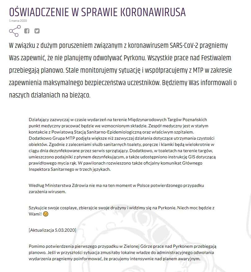 Jako bywalczyni Pyrkonu od początku monitoruję doniesienia na temat koronawirusa i zalecenia dotyczące imprez masowych. Za granicą od dłuższego czasu odwoływane są różne wydarzenia, a w krajach o większej liczbie zarażeń również zamykane są kina, teatry i podobne miejsca, w których zbiera się większa liczba ludzi. IEM w Katowicach zamknięto dla widzów jeszcze przed pojawieniem się pierwszego przypadku zachorowania w Polsce. We Wrocławiu już kilka dni temu wprowadzono zakaz wszelkich zgromadzeń i wydarzeń, na których będzie więcej niż 200 uczestników.
