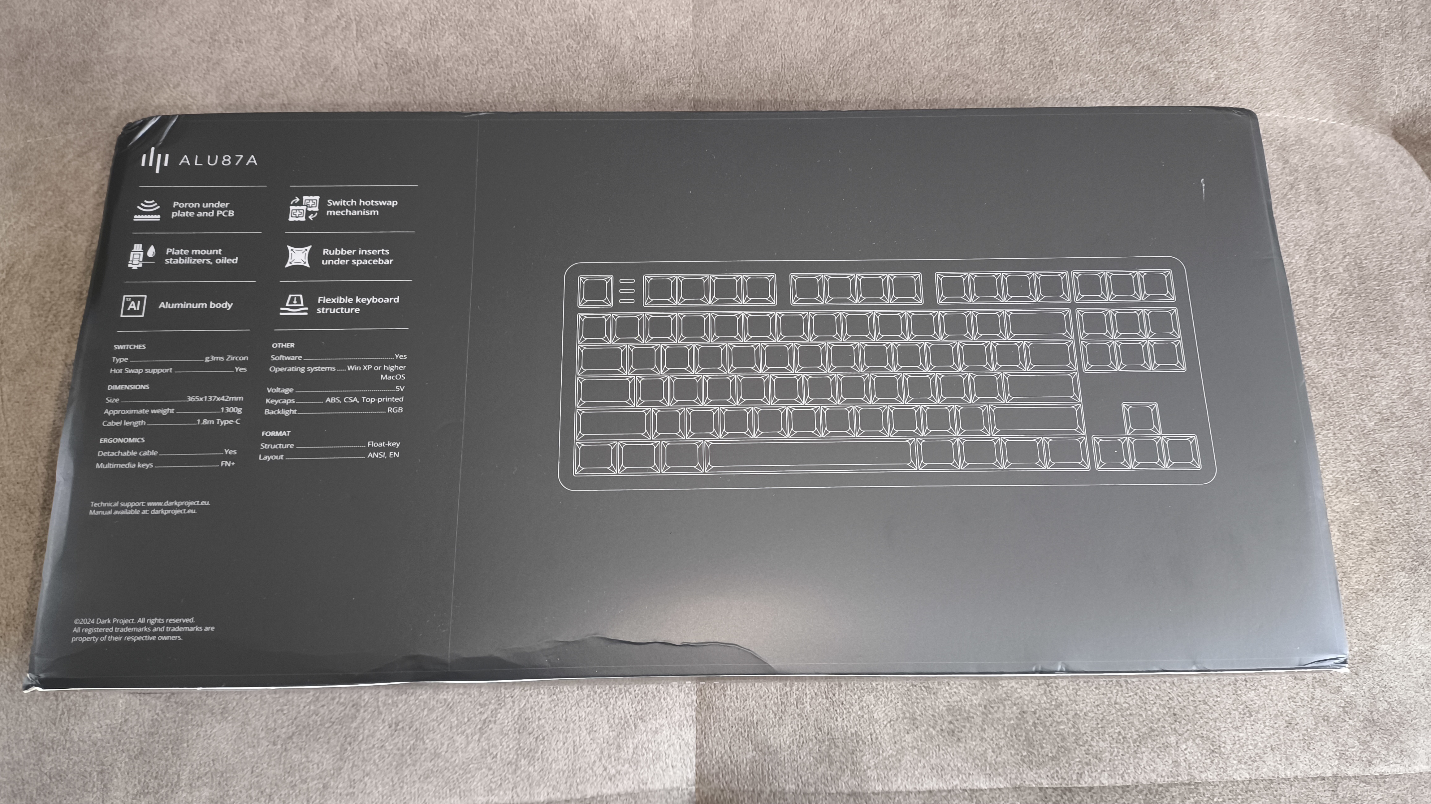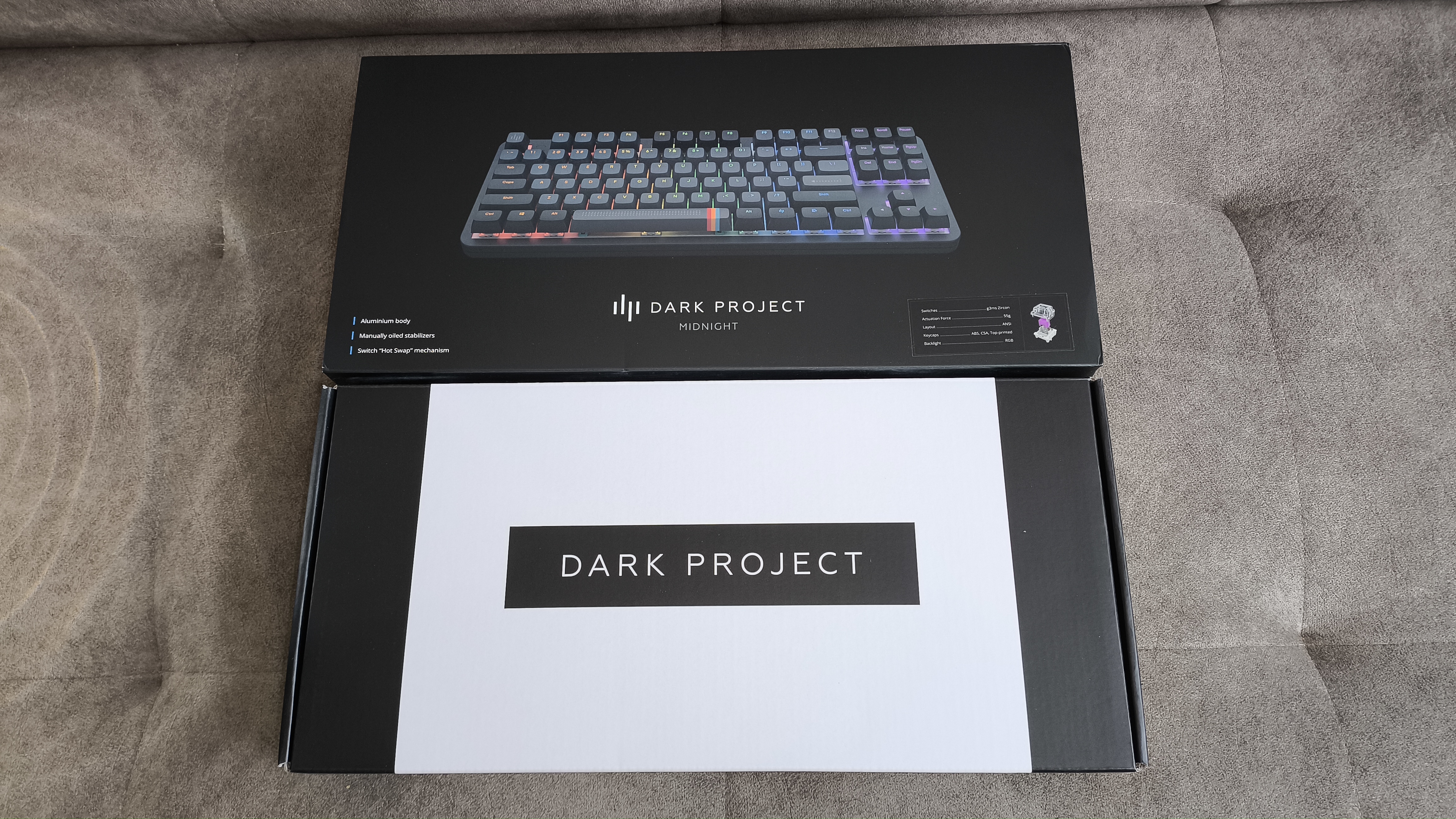Klawiatura Dark Project ALU87A Midnight dostarczana jest w estetycznym, kompaktowym opakowaniu utrzymanym w eleganckiej czarno-białej kolorystyce z minimalistycznym designem. Na froncie pudełka widnieje duże, wyraźne zdjęcie klawiatury ukazujące model Midnight z charakterystycznym podświetleniem RGB, co od razu sugeruje, że mamy do czynienia z produktem skierowanym do entuzjastów sprzętu o nowoczesnym wyglądzie. Logo Dark Project oraz nazwa modelu są umieszczone w widocznym miejscu, co ułatwia szybkie rozpoznanie produktu.
