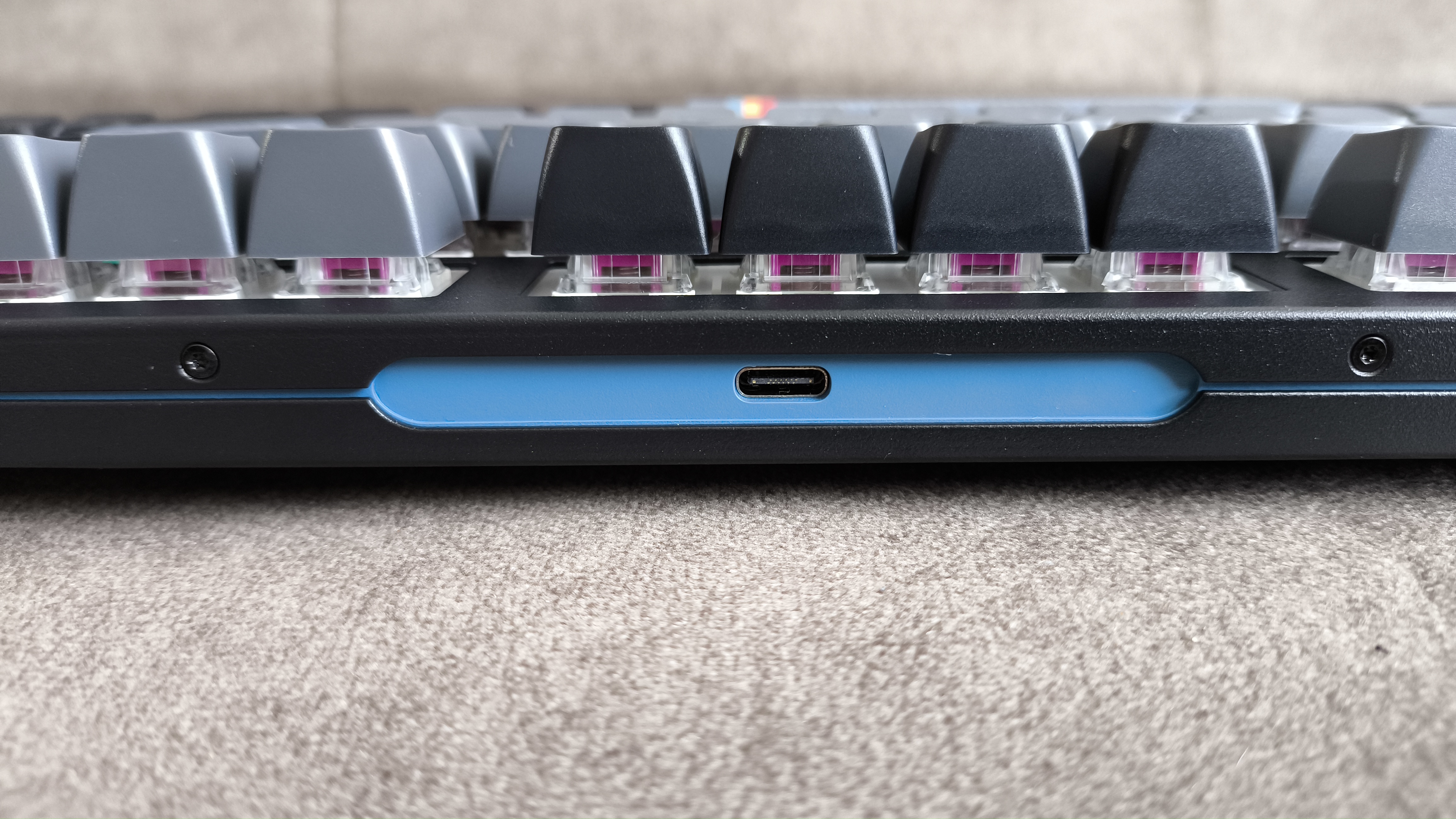 Port USB-C umieszczony jest centralnie z tyłu obudowy, co jest rozwiązaniem powszechnie stosowanym i estetycznym, choć z praktycznego punktu widzenia może powodować drobne niedogodności — kabel może wystawać z tyłu klawiatury, co w niektórych aranżacjach biurek utrudnia ustawienie urządzenia blisko ściany lub innych sprzętów. Brak prowadnic czy zaczepów na kabel wymaga ostrożności, by uniknąć niekorzystnych zgięć, które w dłuższym czasie mogłyby wpływać na trwałość przewodu i portu.