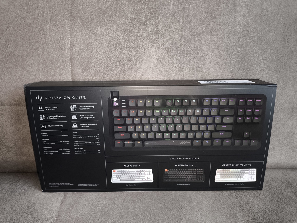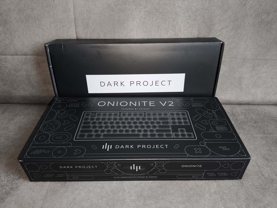 Klawiature Dark Project Onionite V2 dociera do użytkownika w pudełku, które z zewnątrz nie zdradza zbyt wielu nowości względem pierwszej wersji – producent postawił na subtelne odświeżenie wizerunku. Dominującą zmianą jest zmiana kolorystyki z klasycznej bieli na głęboką czerń, nadając całości bardziej stonowany, elegancki i profesjonalny charakter.