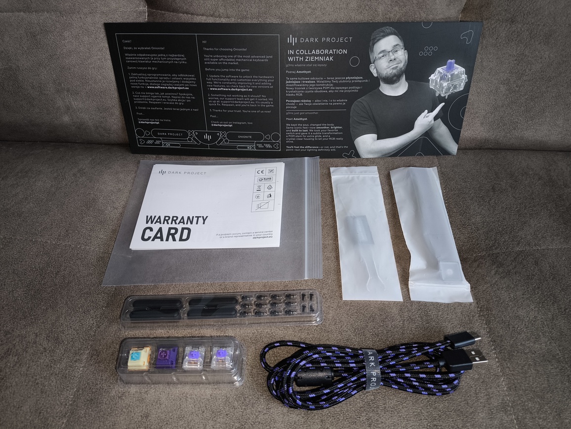 - prawie dwumetrowy przewód USB-A do USB-C, którego kolorystyka została w wersji V2 dopasowana do przełączników i stabilizatorów poprzez fioletowe wstawki, co świadczy o dbałości producenta o spójność wizualną oraz detale estetyczne.
