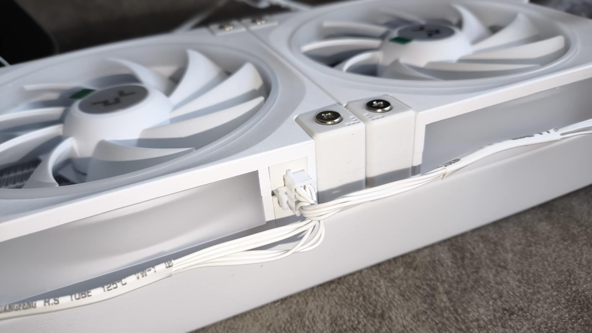 Na jednej z bocznych krawędzi ramki wentylatora umieszczono 8-pinowe złącze, umożliwiające podłączenie załączonego kabla zasilającego, który jednocześnie odpowiada za sterowanie wentylatorami i ich podświetleniem adresowalnym ARGB.