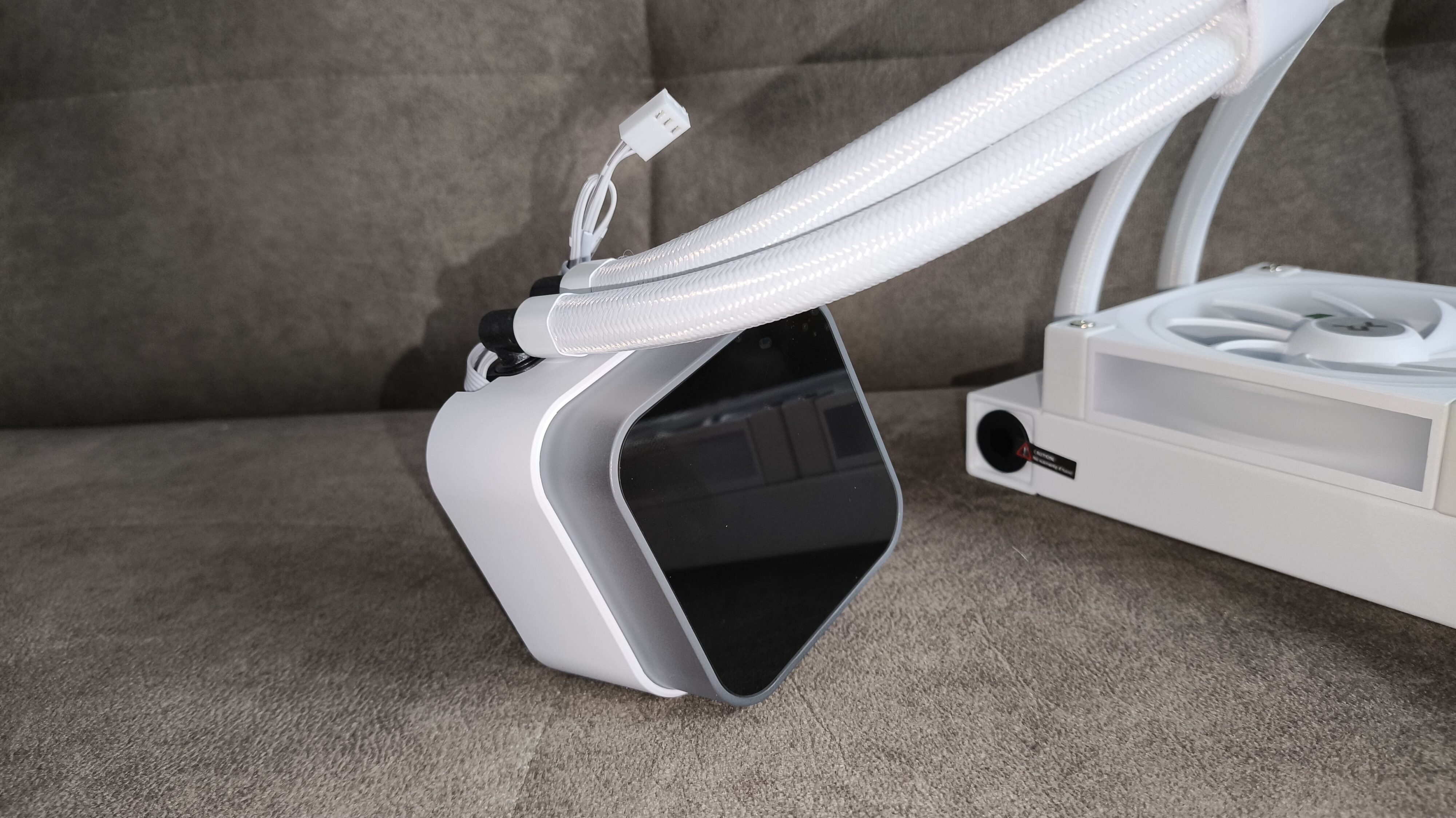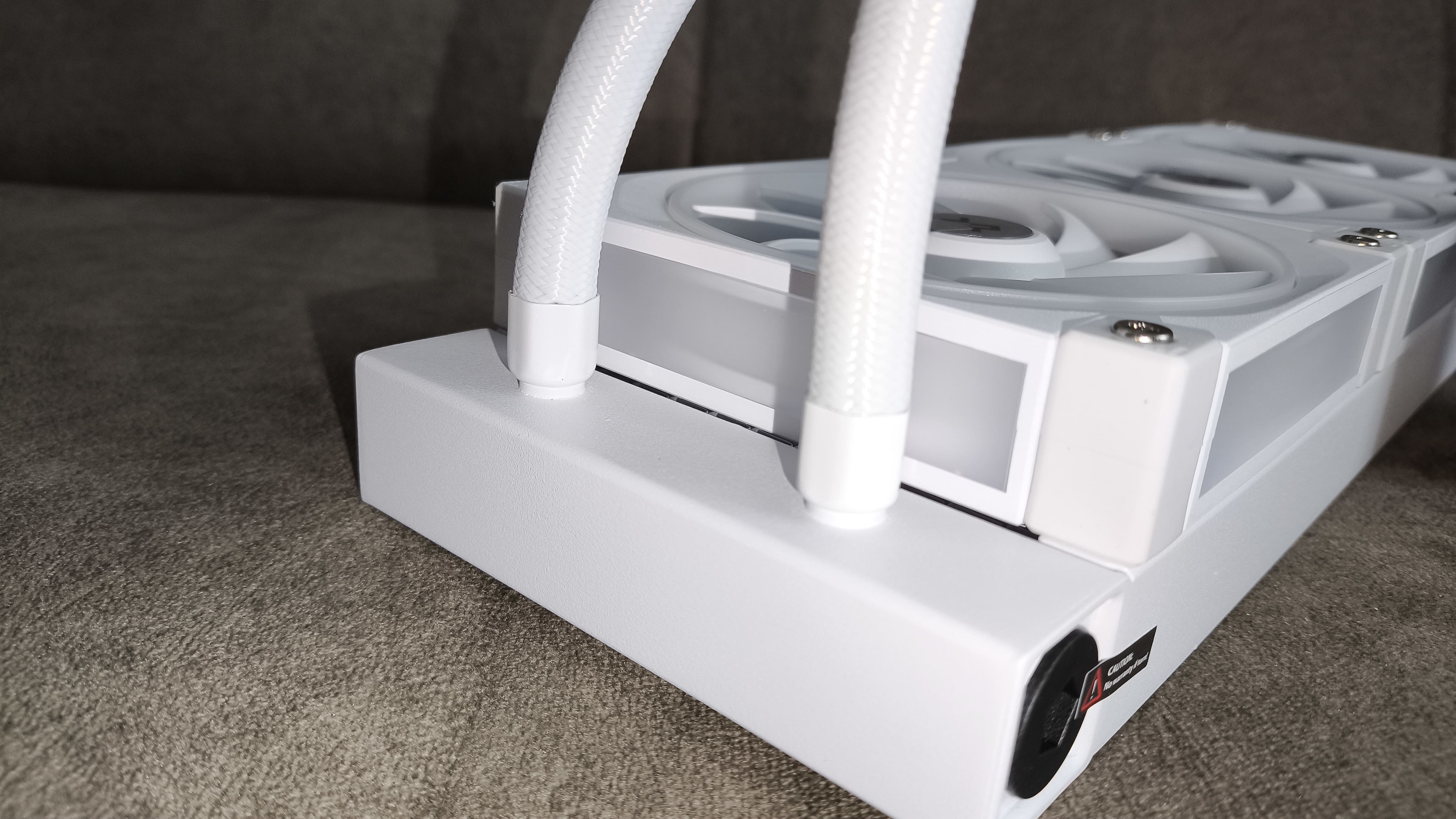 Wężę łączące blok pompy z radiatorem wykonane są z gumy. Dodatkowo zabezpieczone zostały nylonowym oplotem, co poprawia wytrzymałość mechaniczną i estetykę całości. Długość węży wynosi 410 mm, co pozwala na elastyczne ustawienie chłodzenia w różnych konfiguracjach obudowy.