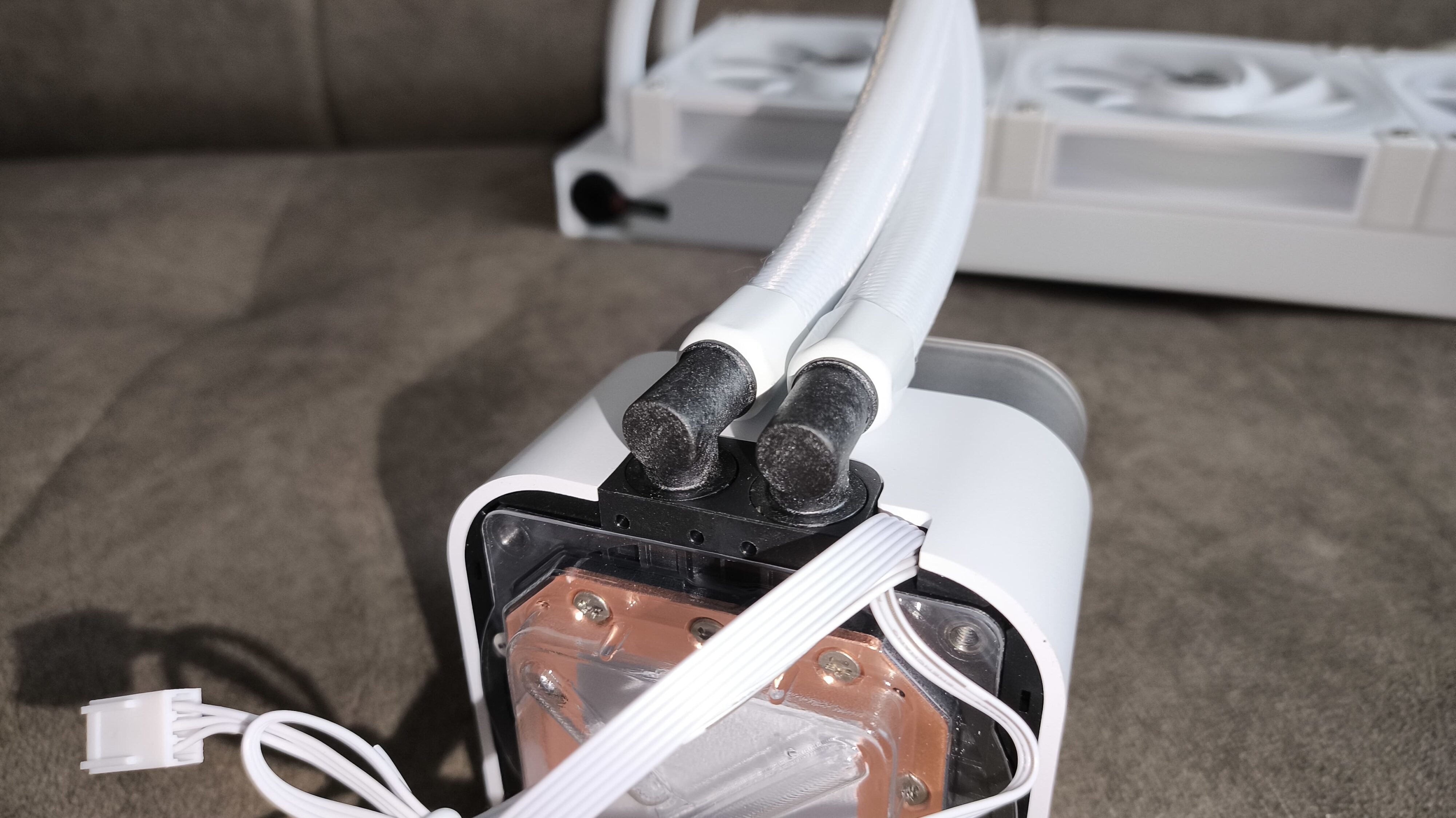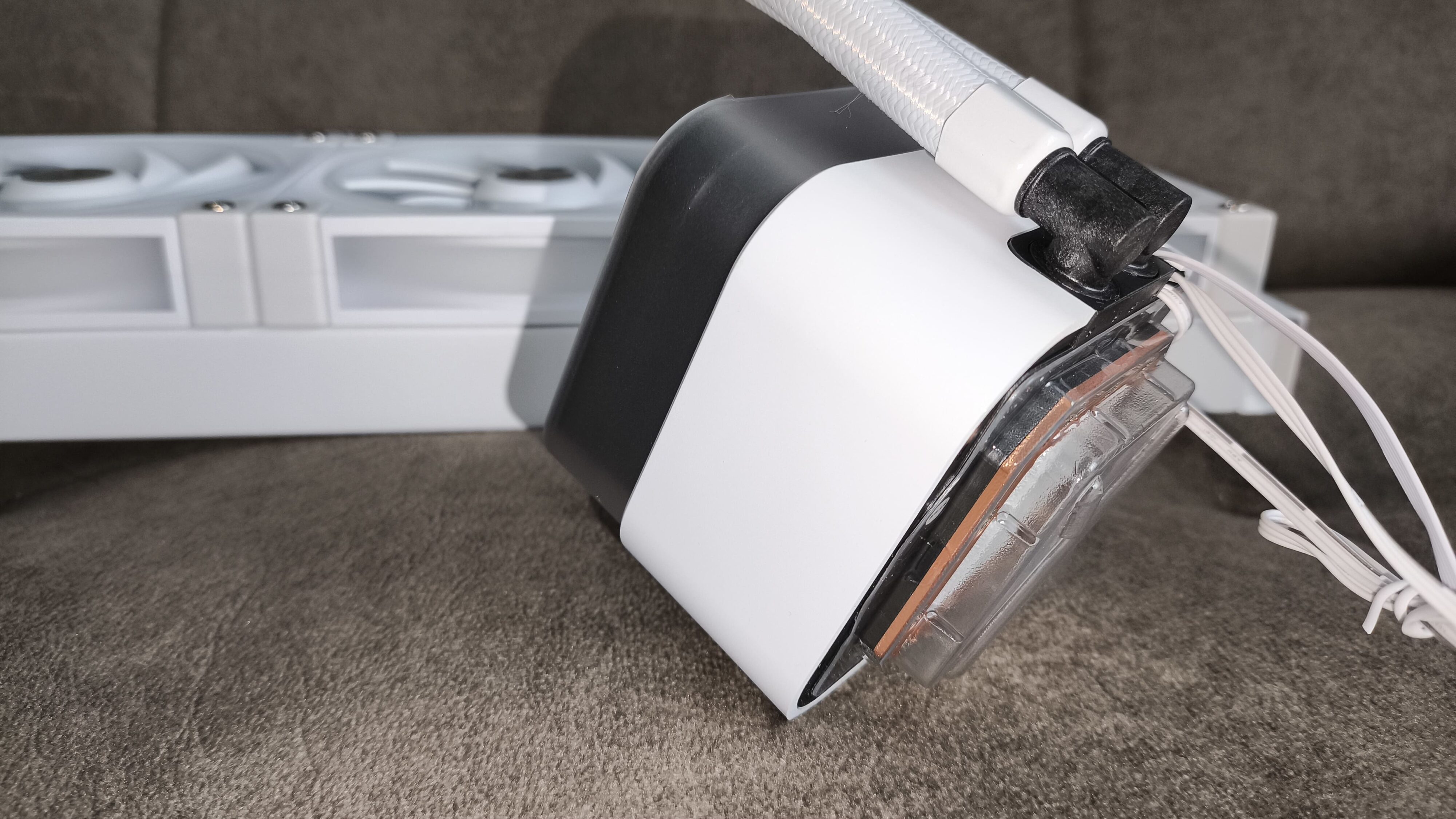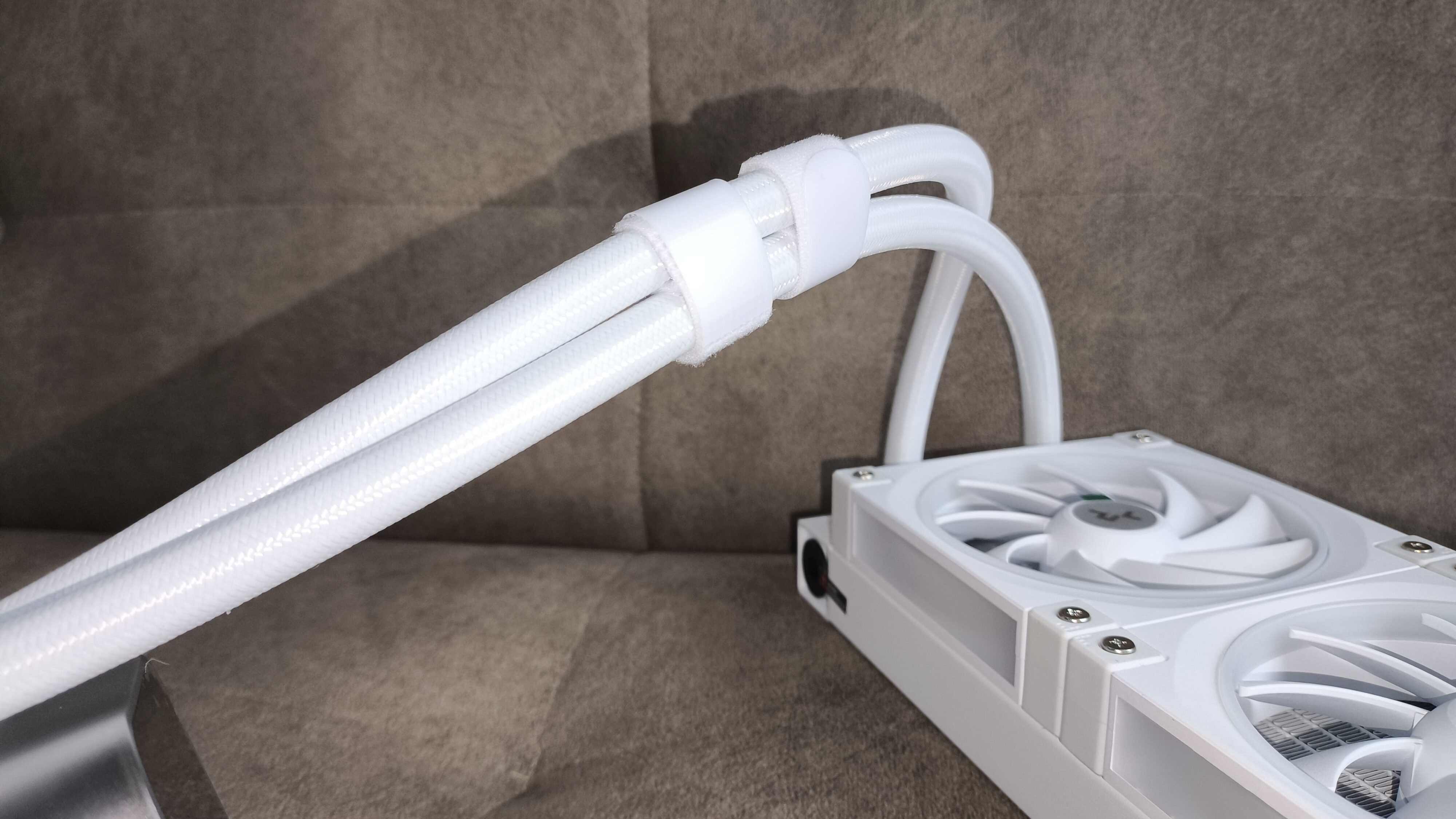 Na jednym z końców węża, przy radiatorze, zastosowano smukły konektor, który kontrastuje z większym, masywnym złączem przy bloku pompy. Dodatkowo, na wężach fabrycznie zamontowano dwie czarne opaski rzepowe, które pomagają w uporządkowaniu okablowania i zapobiegają plątaniu się przewodów.