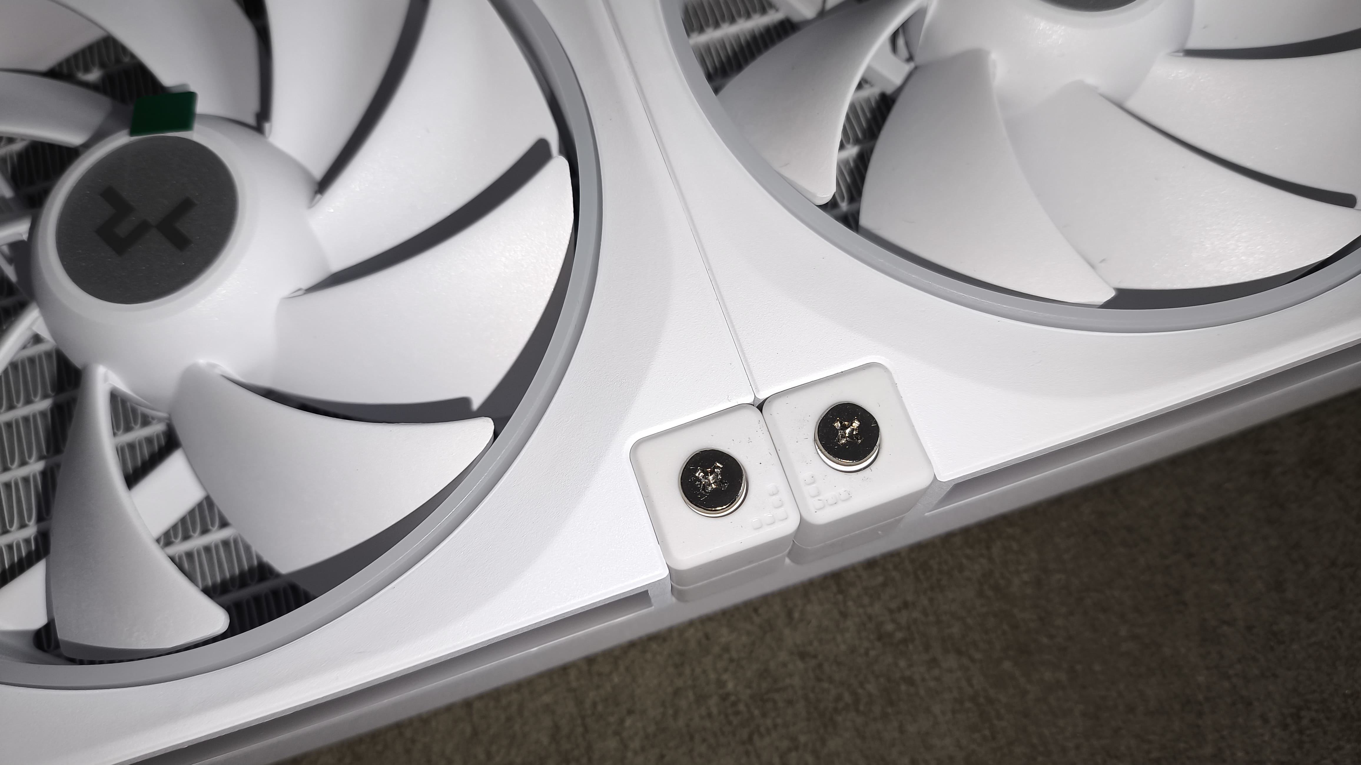 DeepCool zastosował metalowe zaciski, które estetycznie maskują połączenia rur z złączkami typu barb. Pomiędzy tymi połączeniami zachowano znaczącą szczelinę, co świadczy o przemyślanej konstrukcji i ułatwia ewentualne manipulacje podczas montażu.