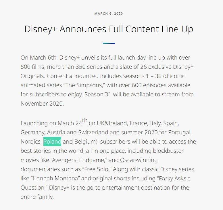 Na stronie Disneya pojawił się oficjalny komunikat informujący o kolejnych tegorocznych premierach platformy Disney +. Wśród wymienionych krajów znalazła się Polska. Jednak nasza radość trwała tylko chwilę, bo niedługo później nasz kraj wykreślono z listy.
