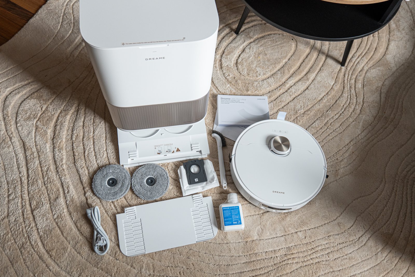 - Robot sprzątający Dreame L40s Pro Ultra (z zamontowaną szczotką główną, szczotką boczną i pojemnikiem na kurz z filtrem),