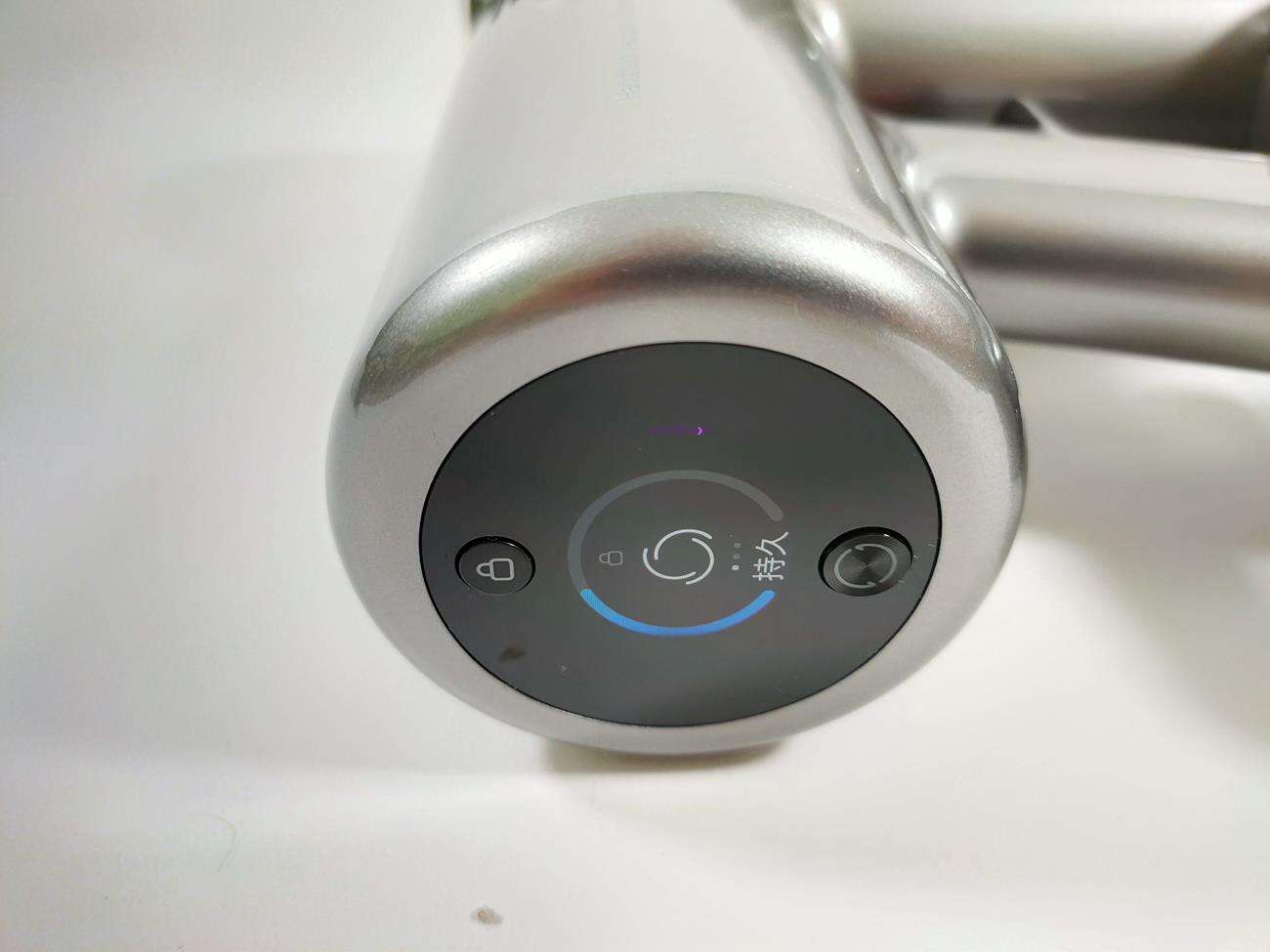 Odkurzacz ma także wyświetlacz OLED. Po podłączeniu do ładowania wyświetla on procentowo poziom naładowania. Podczas działania są jakieś chińskie znaczki, które mogą irytować. Ale można je kompletnie olać i nie zwracać na nie uwagi. Koło wyświetlacza są dwa przyciski. Jeden służy do zmiany trybu pracy (są trzy tryby mocy), a drugi do wspomnianej wcześniej zmiany trybu pracy przycisku.