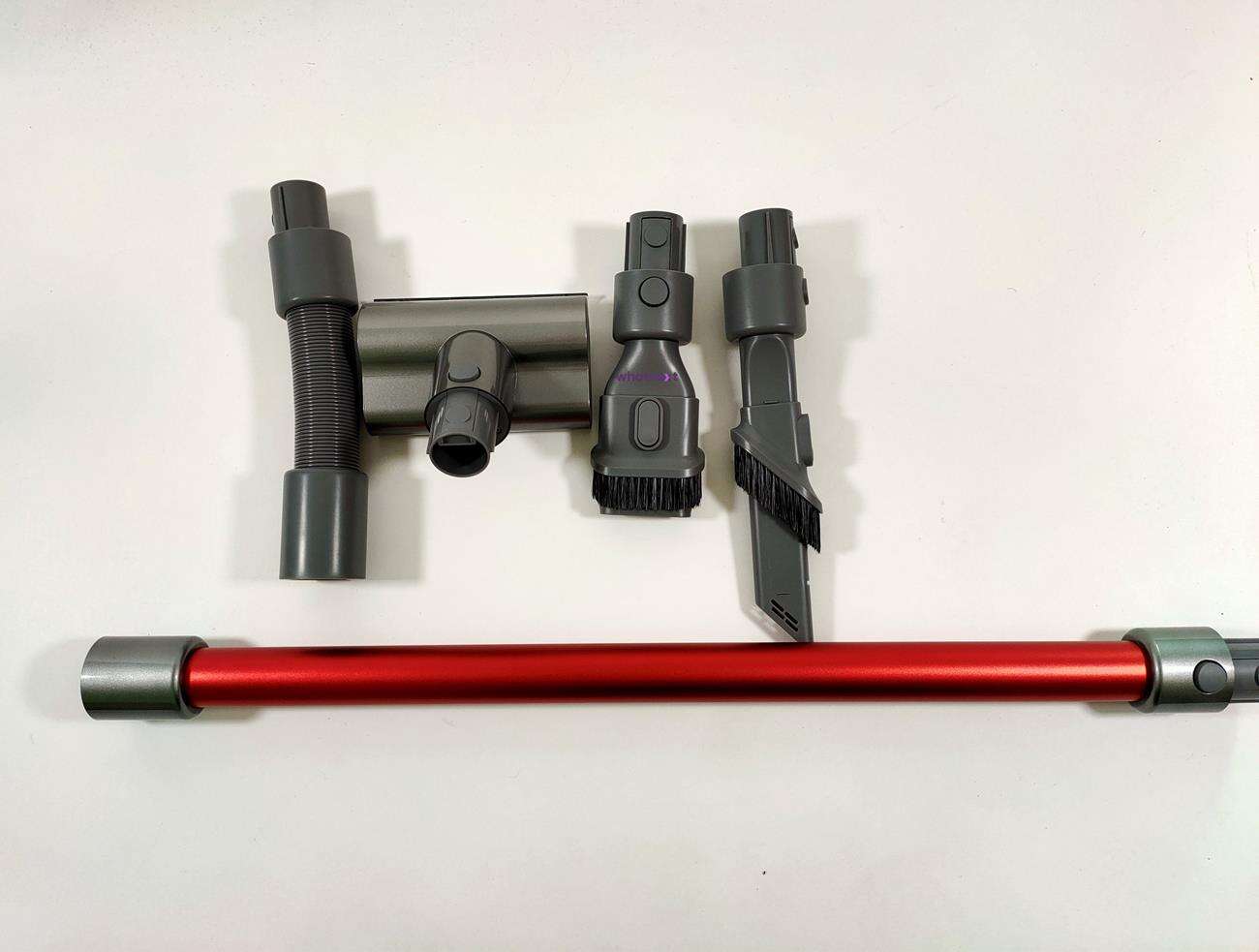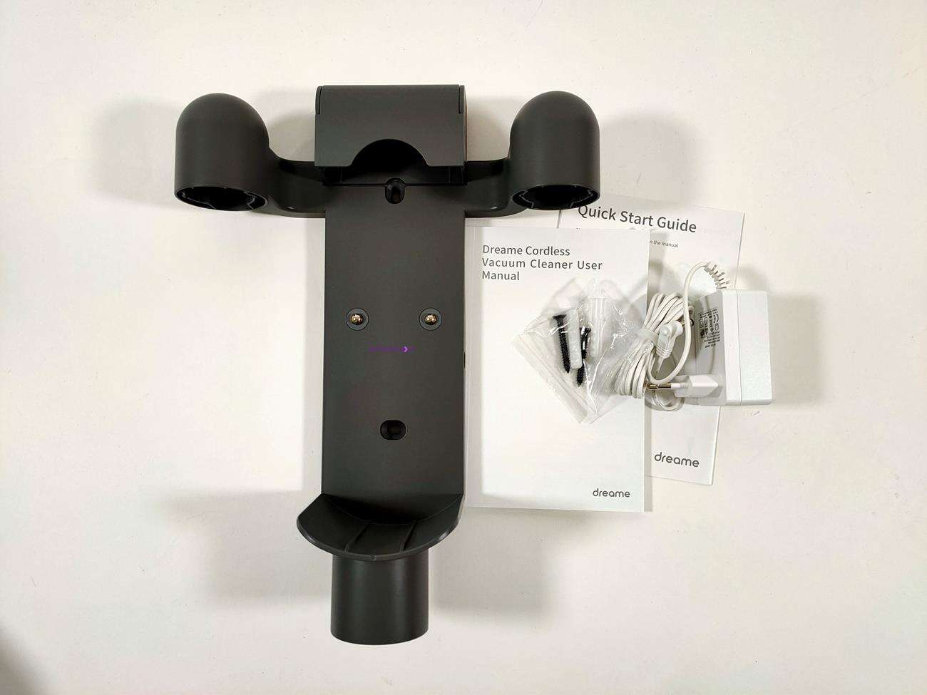 Odkurzacz otrzymujemy w zestawie z kilkoma dodatkami. Jest instrukcja, zasilacz czy zestaw do powieszenia Dreame V11 na ścianie. Warto też zwrócić uwagę na dodatkowe końcówki – jest rura, giętka rura, elektroszczotka z wałkiem, mała elektroszczotka, szeroka końcówka 2 w 1 oraz płaska końcówka 2 w 1. Powinno to zapewnić możliwość wyczyszczenia praktycznie każdego miejsca.
