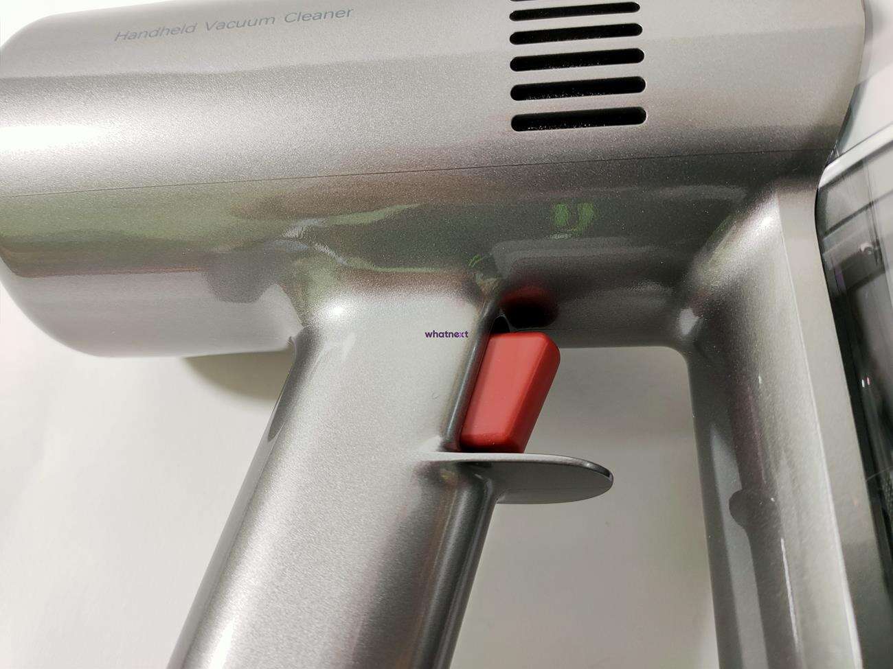 Testowany sprzęt składa się z trzech części. Pierwsza to sam odkurzacz, druga to rury, a trzecia to końcówki. Zacznijmy od tej pierwszej. Odkurzacz ma przycisk, który nie trzeba cały czas trzymać. Można tę funkcję zmienić przyciskiem koło wyświetlacza – wtedy trzeba będzie go cały czas naciskać, aby działał. Na samym dole znajduje się bateria (z diodami pokazującymi poziom naładowania) oraz przycisk do opróżnienia pojemnika na brud. Ten ma pojemność 0,5 l, czyli powinien starczyć na wiele sprzątań.