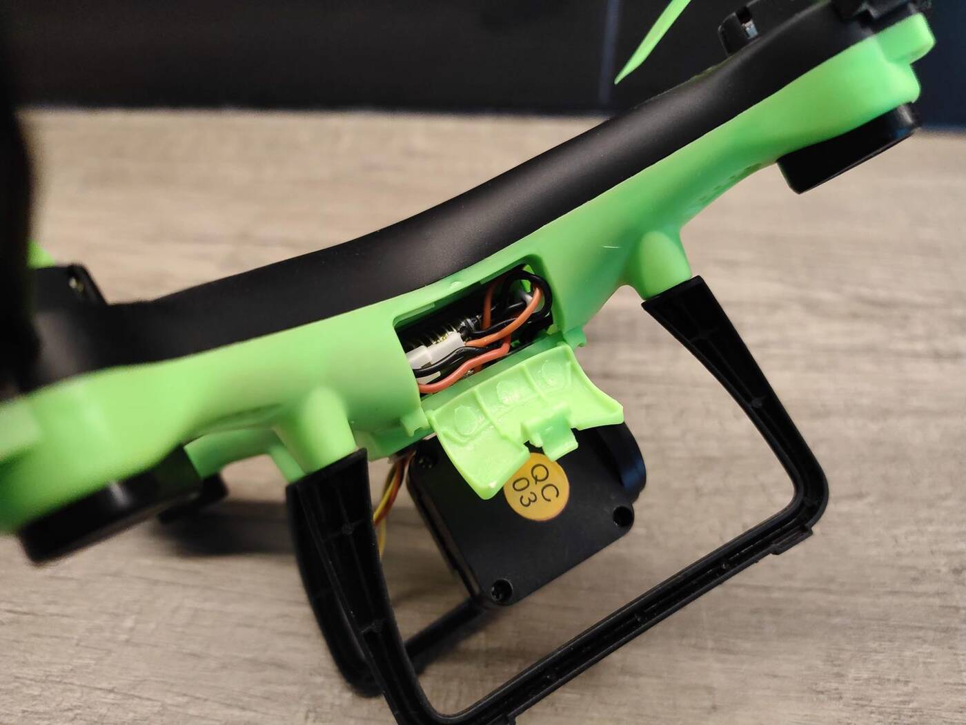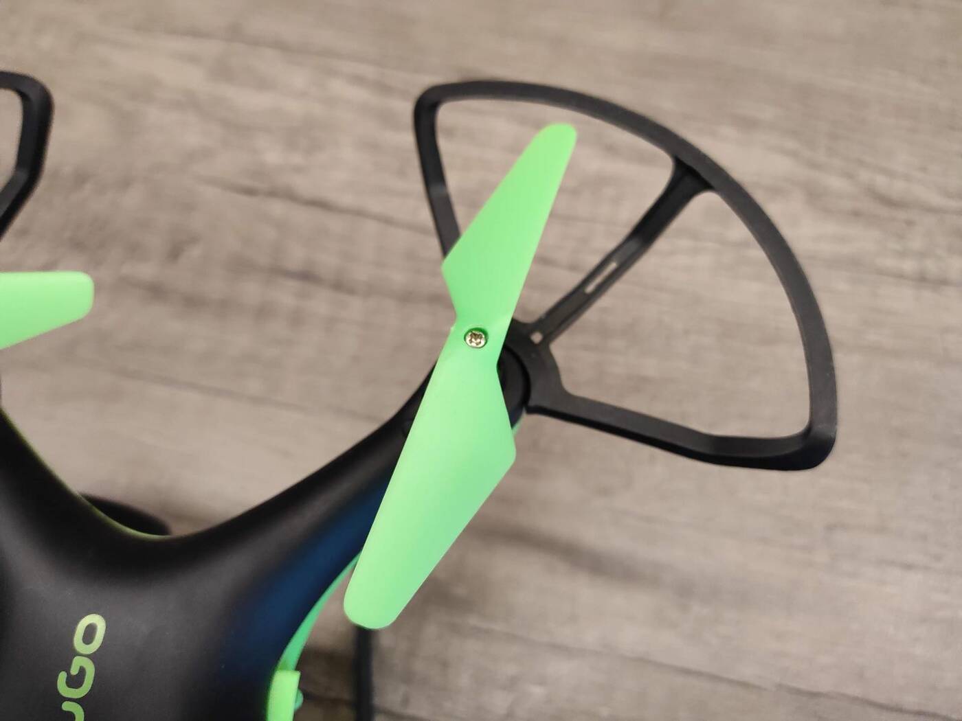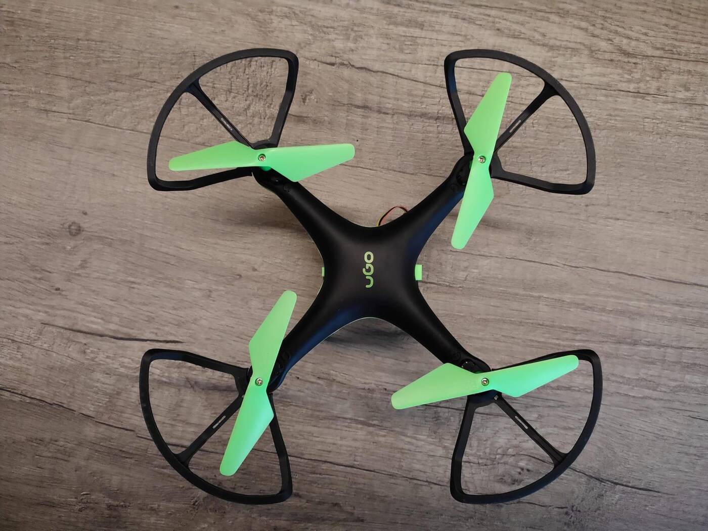 Sam dron sprawia już porządniejsze wrażenia względem kontrolera. Wygląda nawet przyzwoicie, składając się głównie z dwóch plastikowych części w kolorze czarnym i zielonym, a więc połączenia, które obejmuje również pozostałe elementy. Jak to na drona przystało, obudowę buduje elastyczne i cienkie, a więc lekkie tworzywo sztuczne, które wpływa pozytywnie na szybkość i wytrzymałość na jednym ładowaniu. Jego ściśnięcie powoduje pewne skrzypienie materiału, ale w tej cenie nie powinniśmy być aż tak wymagający.