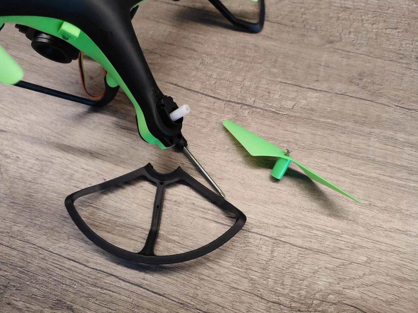 Patrząc na drona „z góry” zauważymy jedynie widoczne gołym okiem śrubki w środku śmigieł, których odkręcenie (kłania się obecność śrubokręta w zestawie) pozwala nam na prostą wymianę każdego z nich.