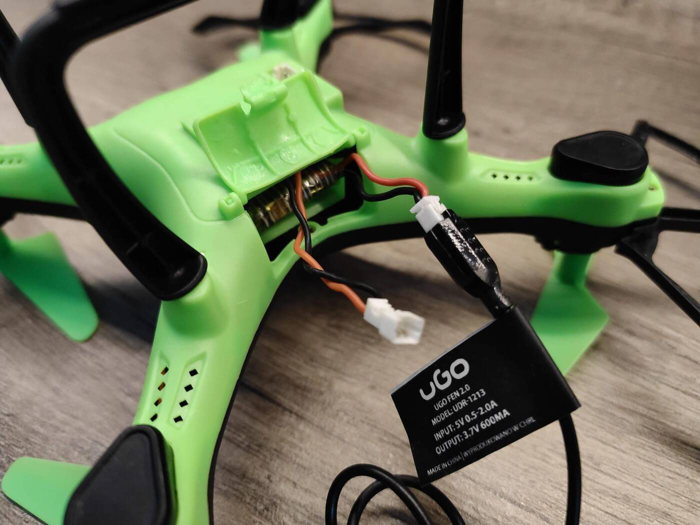 Tego typu podejście nie jest szczytem obecnej technologii, bo wymusza na użytkowniku wypięcie baterii od złącza drona podczas ładowania dołączonym przewodem, a następnie ponowne połączenie wtyków na dwóch kabelkach ze sobą. Niskim budżetem i chińszczyzną pachnie więc na kilometr, ale cóż, takie życie. Możemy jednak cieszyć się, że zamawiając podobne baterie, będziemy mogli zapewnić sobie pokład energii dla drona na dłużej, wymieniając je po prostu po rozładowaniu.