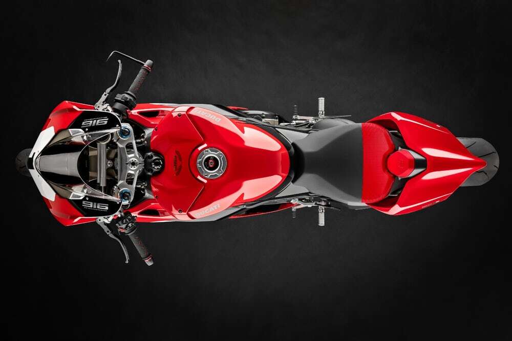 25th Anniversario 916 dostało oczywiście odmieniony wygląd i nic dziwnego. Przód zapożycza od Ducati Corse, nadwozie maluje w czerwień z plamami bieli, a całość dopina logiem Shella, tłumik wymienił na ten od Akrapovic, koła również i to na magnezowe Marsechini, ale to nawet nie koniec zmian. Te nie obeszły wyświetlacza, błotników (teraz są wykonane z tworzywa węglowego), jak zresztą osłona wahacza, czy sprzęgła. Całość dopina plakietka z numerem jednego z 500 egzemplarzy. Słodko.