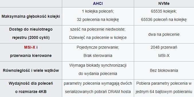 Różnica między protokołem AHCI i NVMe jest ogromna, co pokazuje tabelka prosto z Wikipedii: