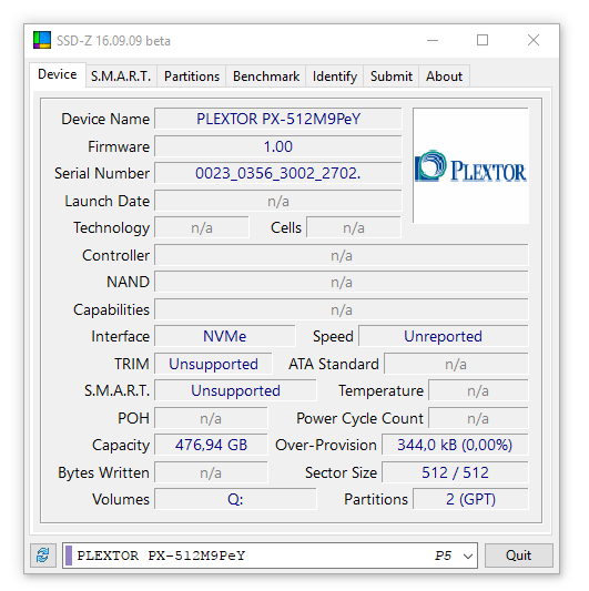 Specyfikacja techniczna nośnika Plextor M9Pe NVMe 512 GB