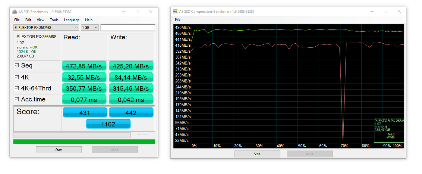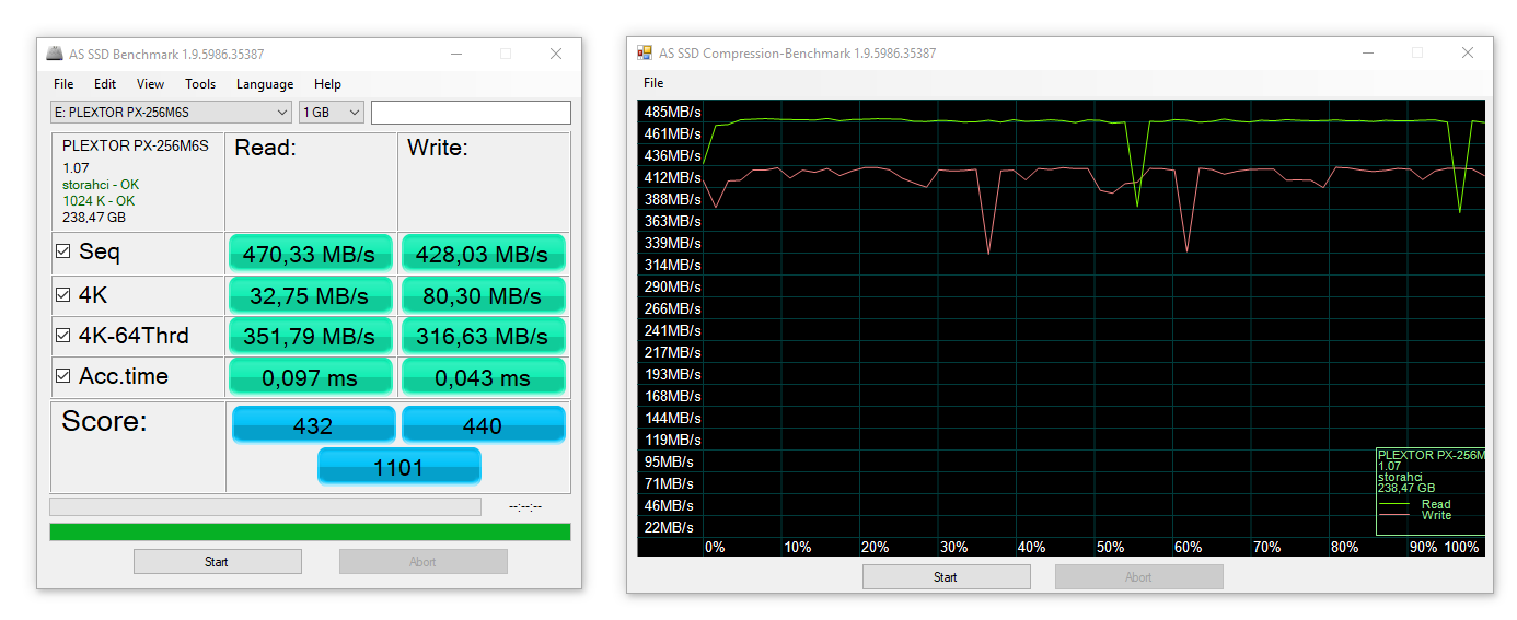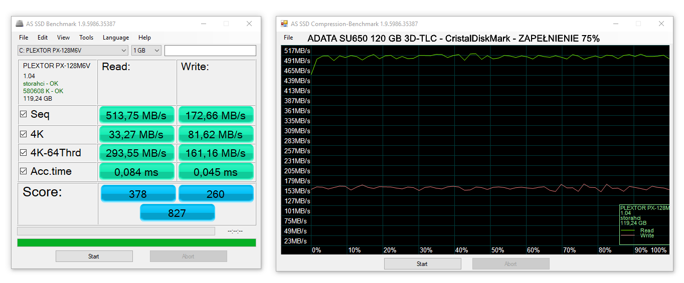 Strona główna Testy Dyski Testy syntetyczne – AS SSD @ CristalDiskMark AS SSD Benchmark AS SSD Compression test ADATA SU650 120 GB Plextor M6S 256 GB Plextor M9Pe(Y) 512 GB Samsung Portable SSD T5 1 TB CristalDiskMark