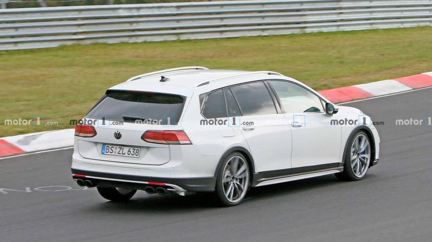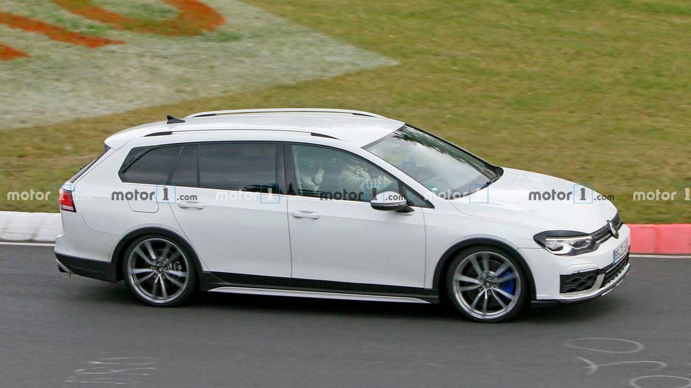 Chociaż przedni zderzak i plastikowe okładziny nadwozia na nadkolach wskazują na wydanie Alltrack, to cztery wydechy, niebieskie zaciski hamulcowe i same opony wskazują jasno na Golfa R Variant. Producent postarał się nawet o niezauważalny na pierwszy rzut oka kamuflaż na światłach, aby zasugerować, że to Variant poprzedniej generacji (via Motor1).