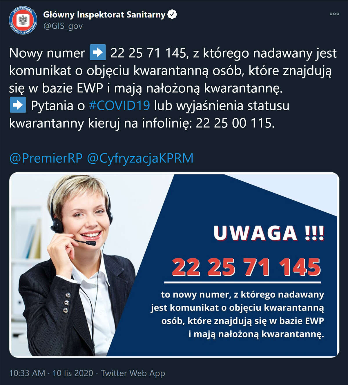 Główny Inspektorat Sanitarny informuje, że uruchomiono nowy numer, z którego nadawany jest komunikat o objęciu kwarantanną. Pamiętajcie więc, że jeśli dzwoni do Was numer 222571145 lepiej odbierzcie telefon.