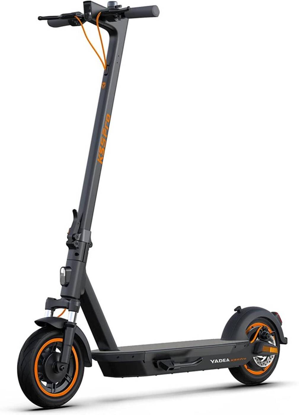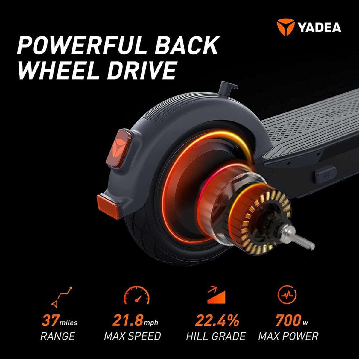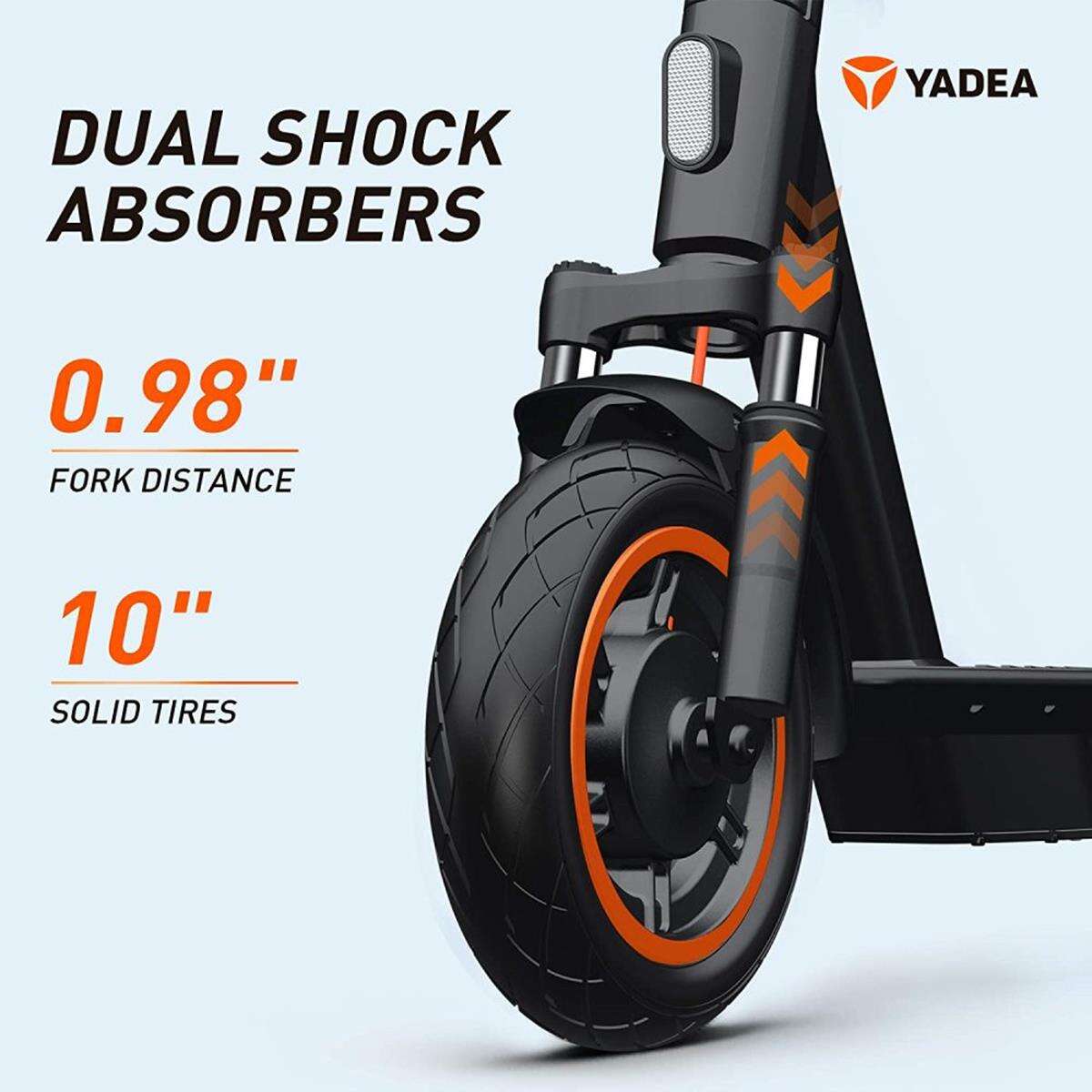 Elektryczne hulajnogi Yadea KS5 wyróżniają się silnikiem elektrycznym nie w przednim, a tylnym kole, jak również potrójnym układem hamulców, na który to składa się bębnowy z przodu i tarczowy oraz rekuperacyjny z tyłu. Takie połączenie zapewnia zalety ze świata zarówno hamulców tarczowych, jak i bębnowych, a więc w ogólnym rozrachunku mniejszą potrzebę konserwacji i lepsze, mocniejsze hamowanie.