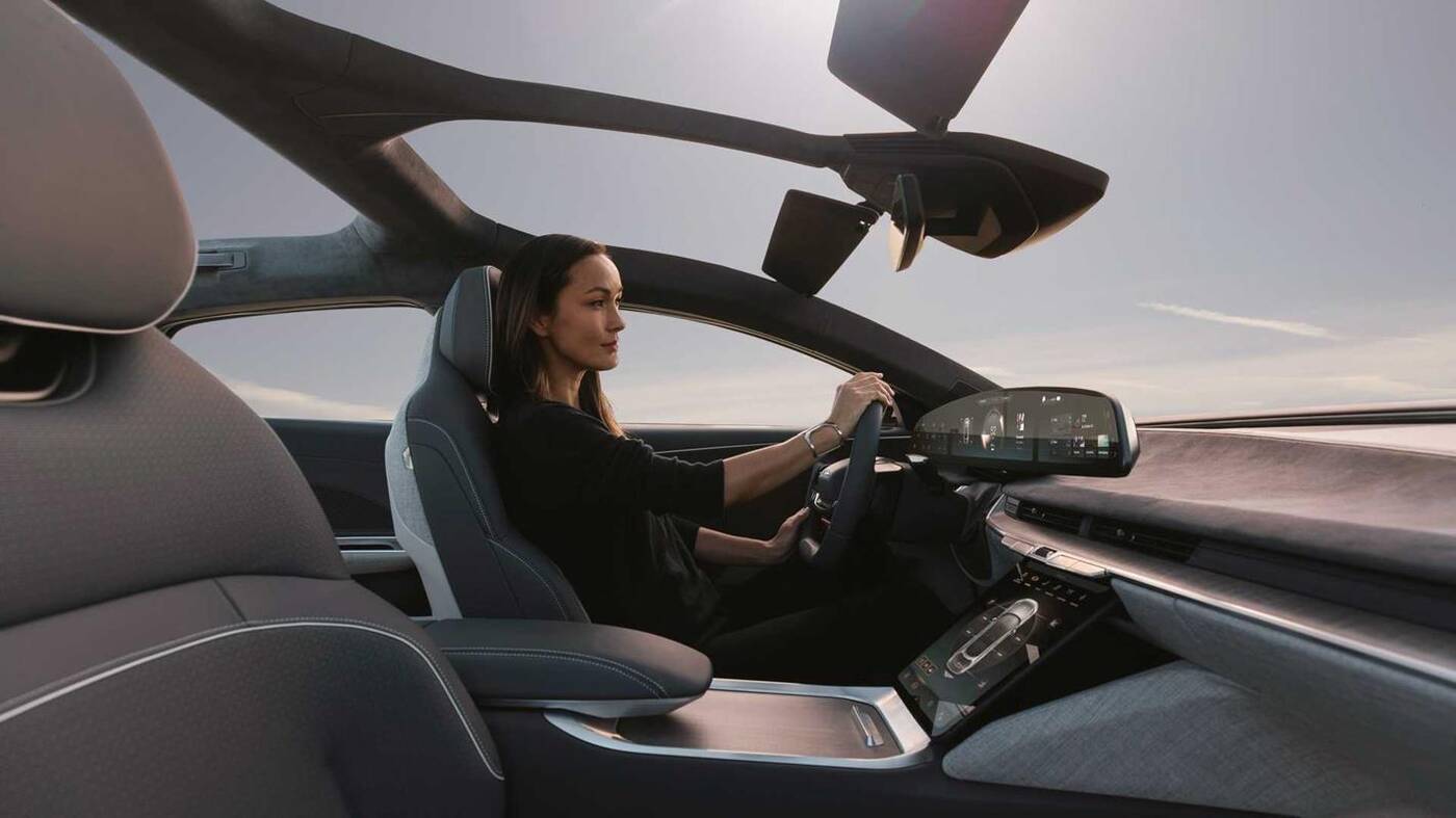 Nic dziwnego, przed nim znajduje się ogromny 34-calowy, zakrzywiony szklany wyświetlacz 5K, który wydaje się unosić nad deską rozdzielczą. Oprócz wyświetlaczy cyfrowych, w kabinie znalazło się kilka wyczuwalnych, precyzyjnie frezowanych fizycznych elementów sterujących. Nie zabrakło wsparcia dla asystenta Alexa, czy potencjału większej ilości funkcji dostarczanych przez aktualizacje OTA (over-the-air).
