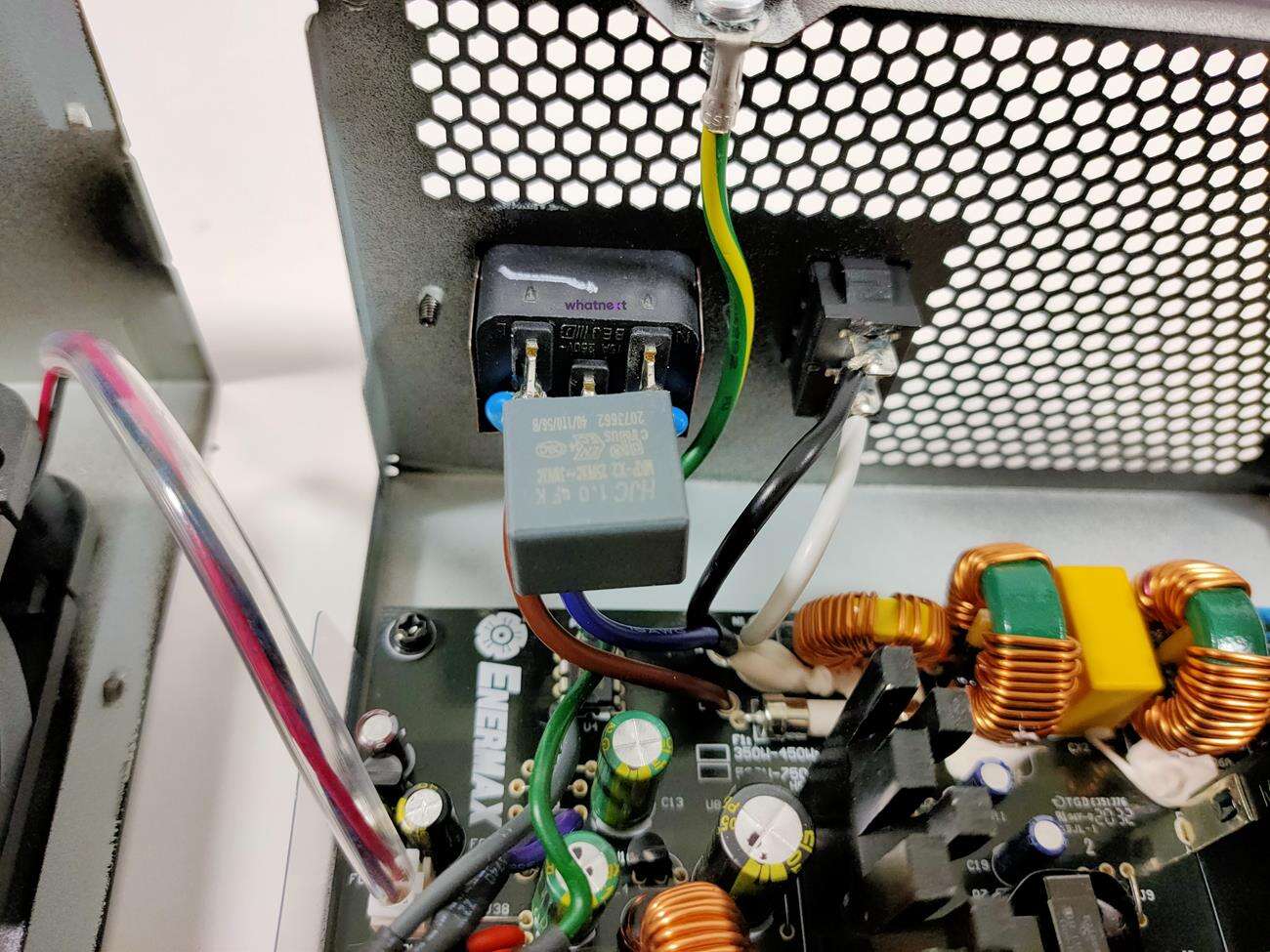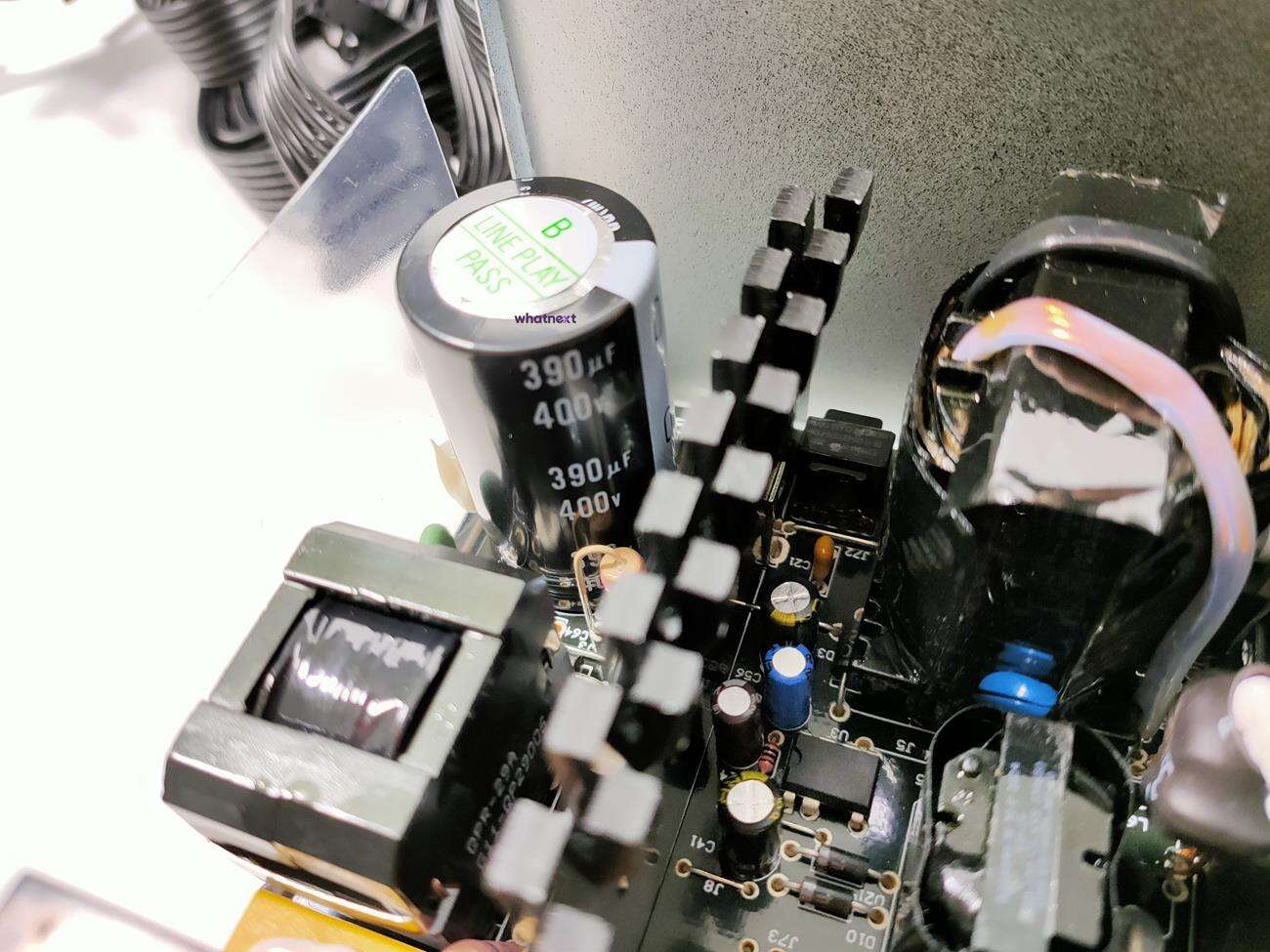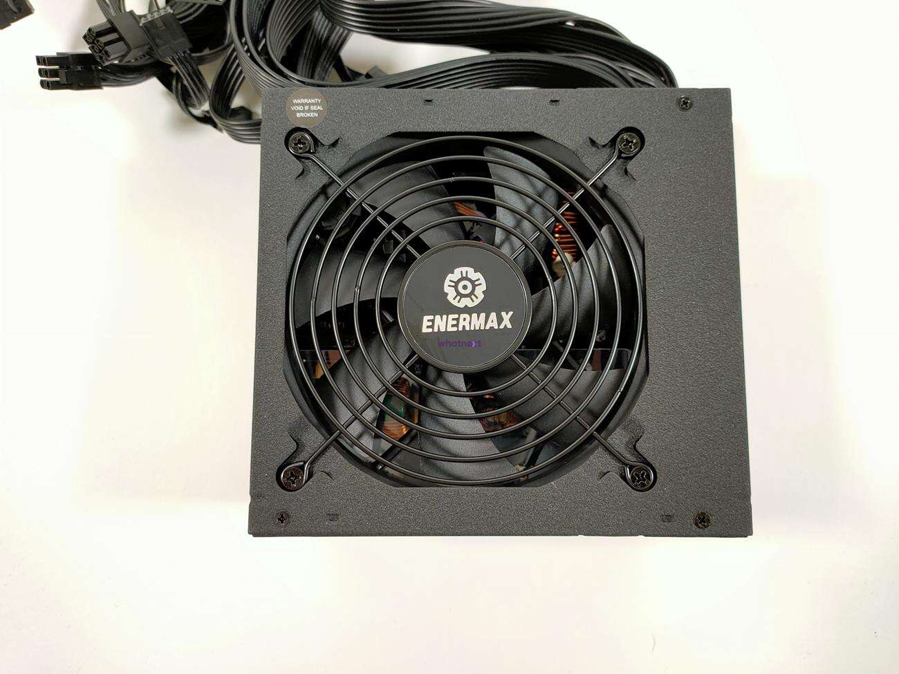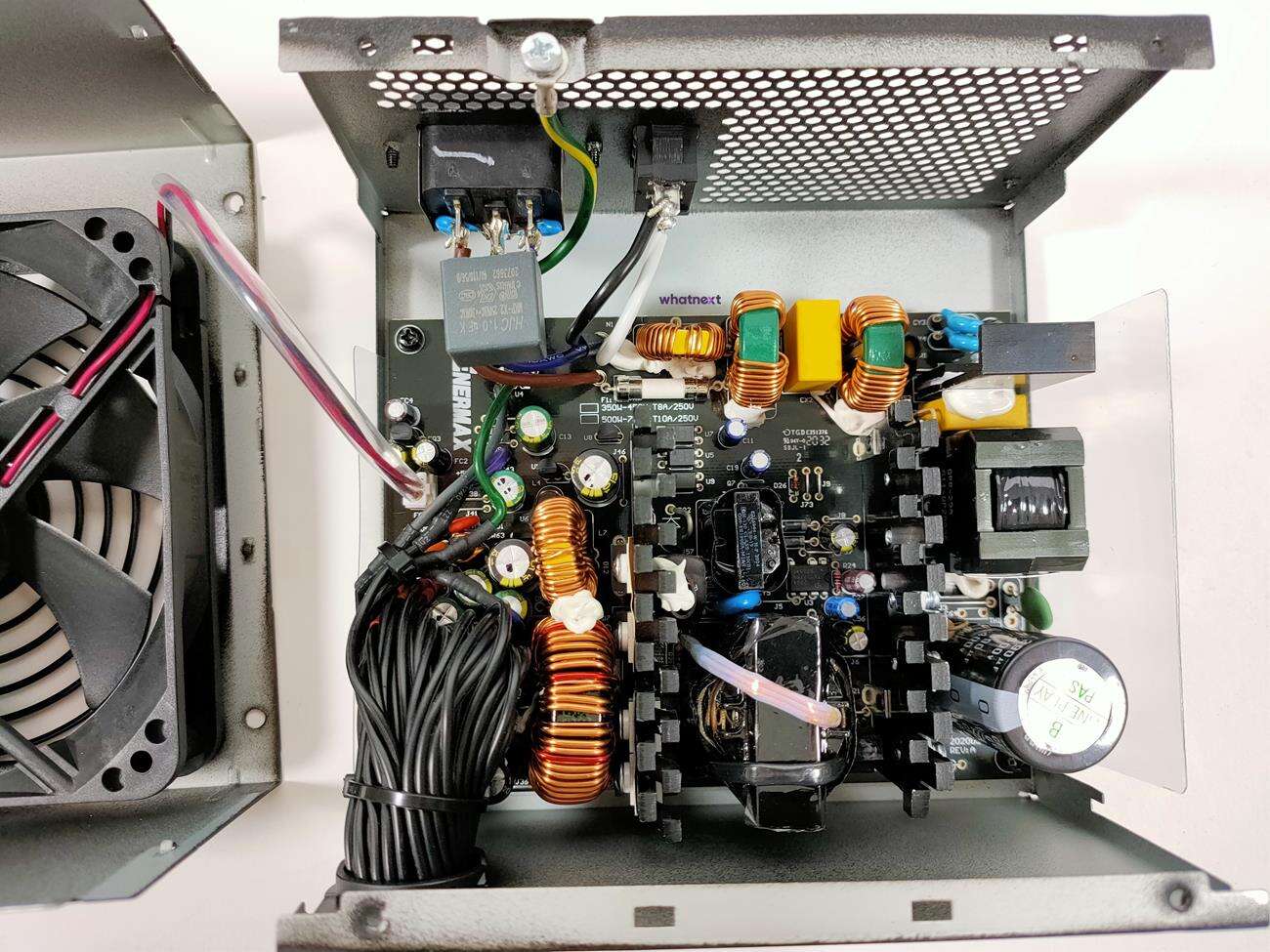 Wnętrze jest bardzo dobrze wykonany – jak to zazwyczaj bywa z Enermaxem. Główny kondensator jest produkcji Nichicon (Japonia) i ma parametry 400 V, 390 uF i może pracować w temperaturze do 105°. Nie zabrakło też oczywiście aktywnego PFC czy zgodności z Intel ATX12V 2.3. Zastosowane zabezpieczenia to zabezpieczenie przed zwarciem (SCP), zabezpieczenie nadnapięciowe (OVP), zabezpieczenie podnapięciowe (UVP), zabezpieczenie nadmocowe (OPP) oraz SIP (zabezpieczenie przed nieprzewidzianymi prądami udarowymi).