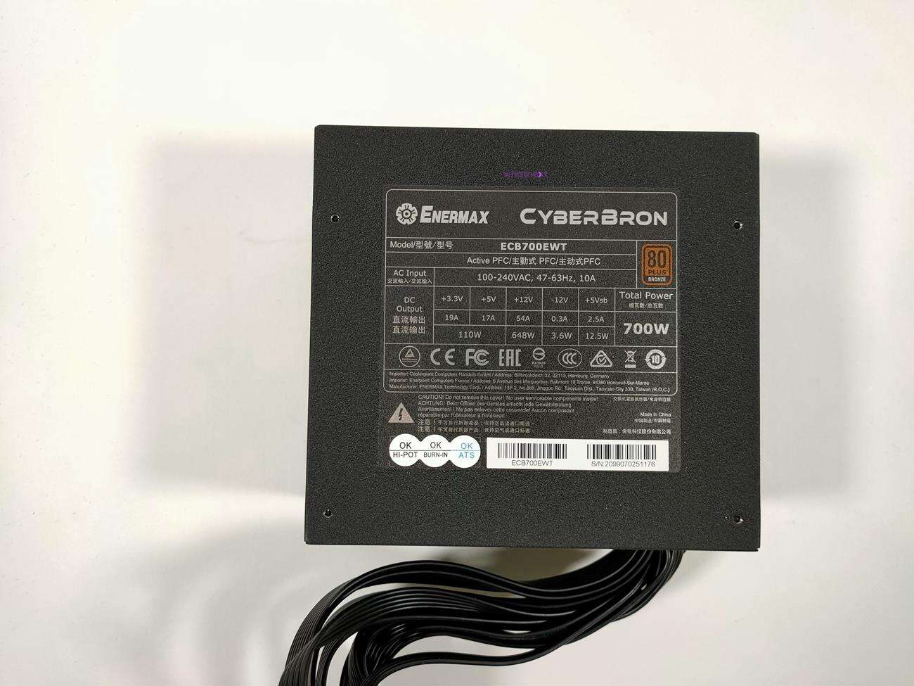 Z tyłu tradycyjnie znajdują się otwory w kształcie plastrów miodu. Jets też włącznik oraz miejsce na kabel. Tabliczka znamionowa znajduje się po przeciwnej stronie od wentylatora. Enermax CyberBron 700W ma jedną linię + 12 o mocy 648 W (54 A). Linie +3,3 V i +5 V o łącznej mocy 110 W (+3,3 V 19 A, +5V 17 A).