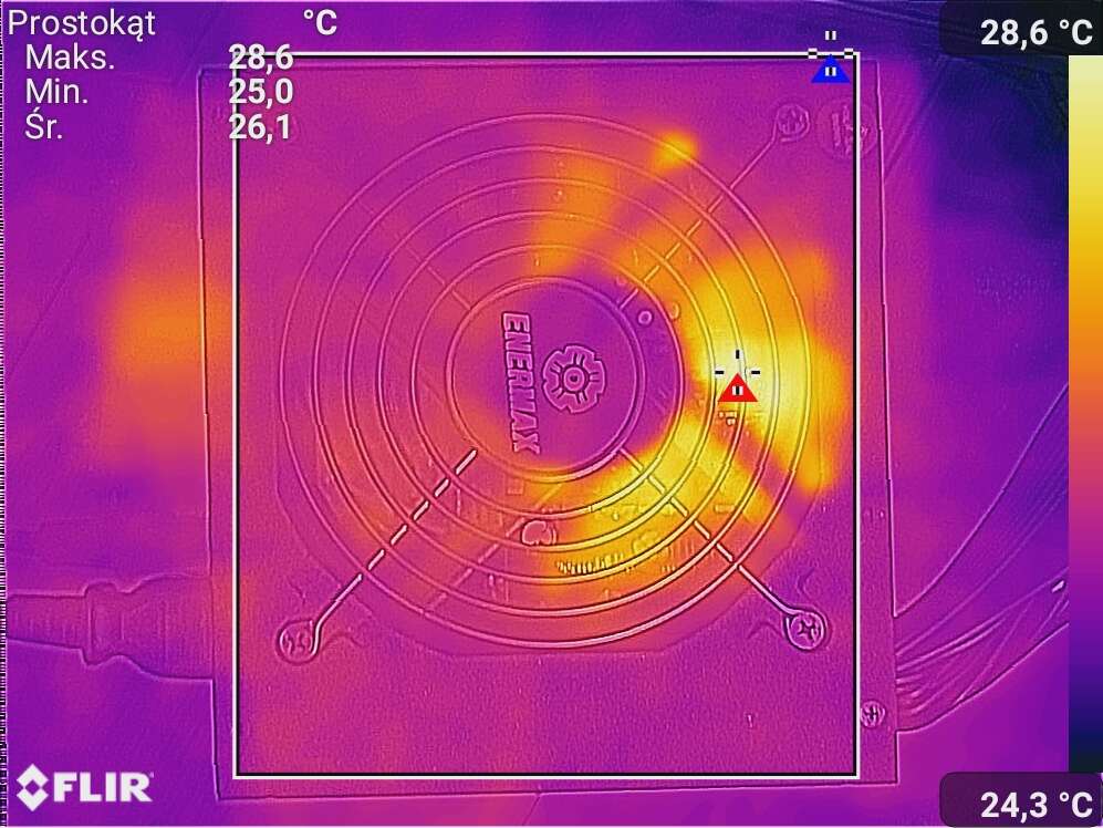 Zasilacz oczywiście spełnia wszystkie normy. Widoczny jest jednak spadek napięcia na linii +12 V pod obciążeniem, ale PSU spokojnie poradziło sobie z powyższą platformą testową. Nie ma więc tutaj obaw o stabilność działania zestawu. całość też działa cicho w spoczynku i pod obciążeniem. W tym drugim przypadku kamera termowizyjna zanotowała trochę wysoką temperaturę, ale tutaj również wszystko jest w granicach normy (producent deklaruje pracę 24/7 przy 40°C). Całość ma odznaczenie 80 Plus Bronze. Dla obciążenia 10% sprawność wynosi 82,64%, dla 20% – 87,04%, 50% – 87,76%, a dla 100% – 83,83%.