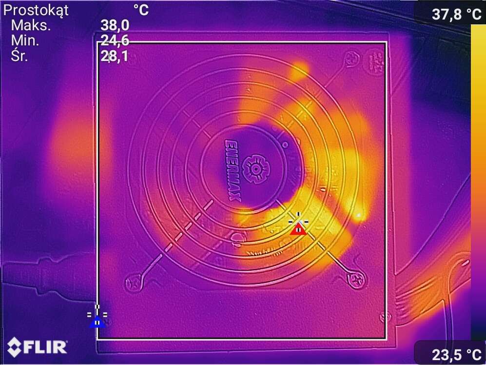 Zastosowany wentylator to 120 mm konstrukcja firmy Yate Loon. Enermax deklaruje, że przy 100% obciążeniu jego głośność wynosi 30,8 dBA, a przy 50% i niższym tylko 18 dBA. Przy mniejszych obciążeniach powinno być więc stosunkowo cicho.