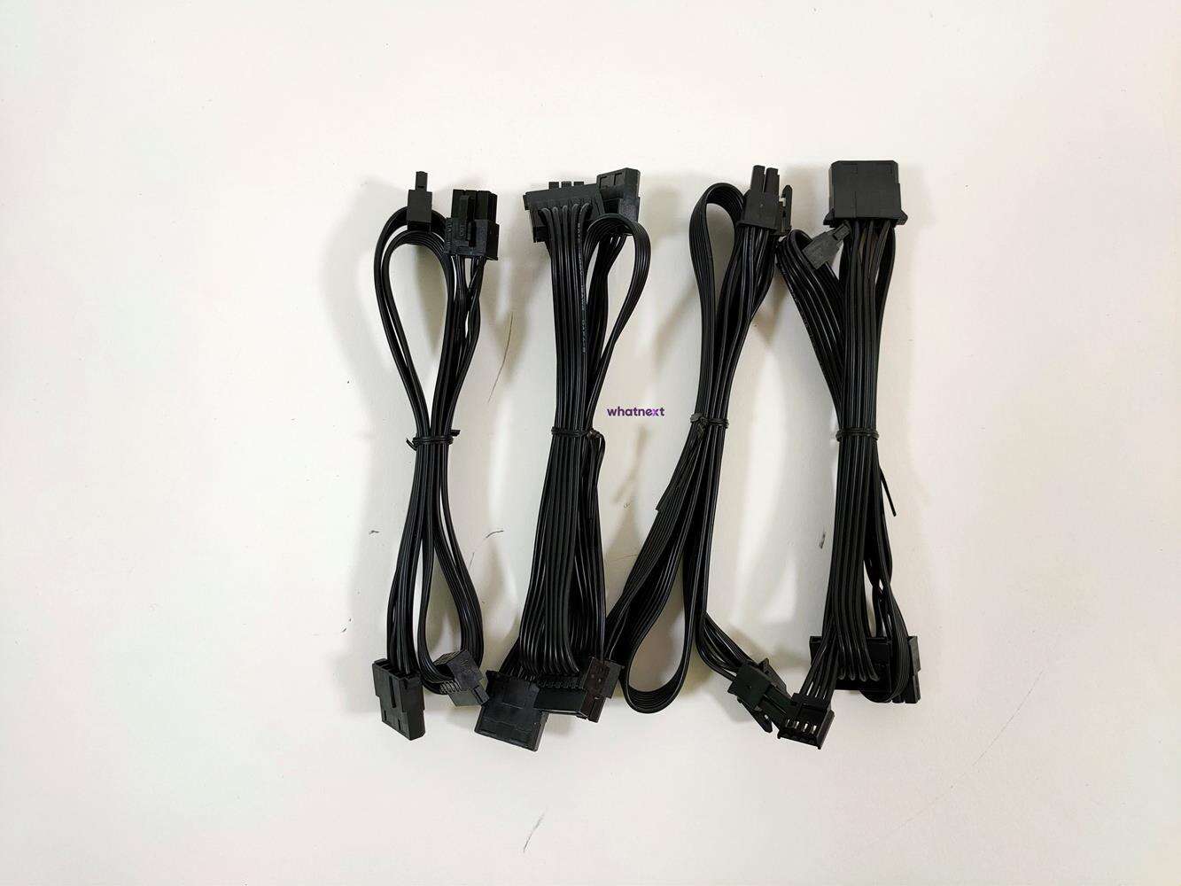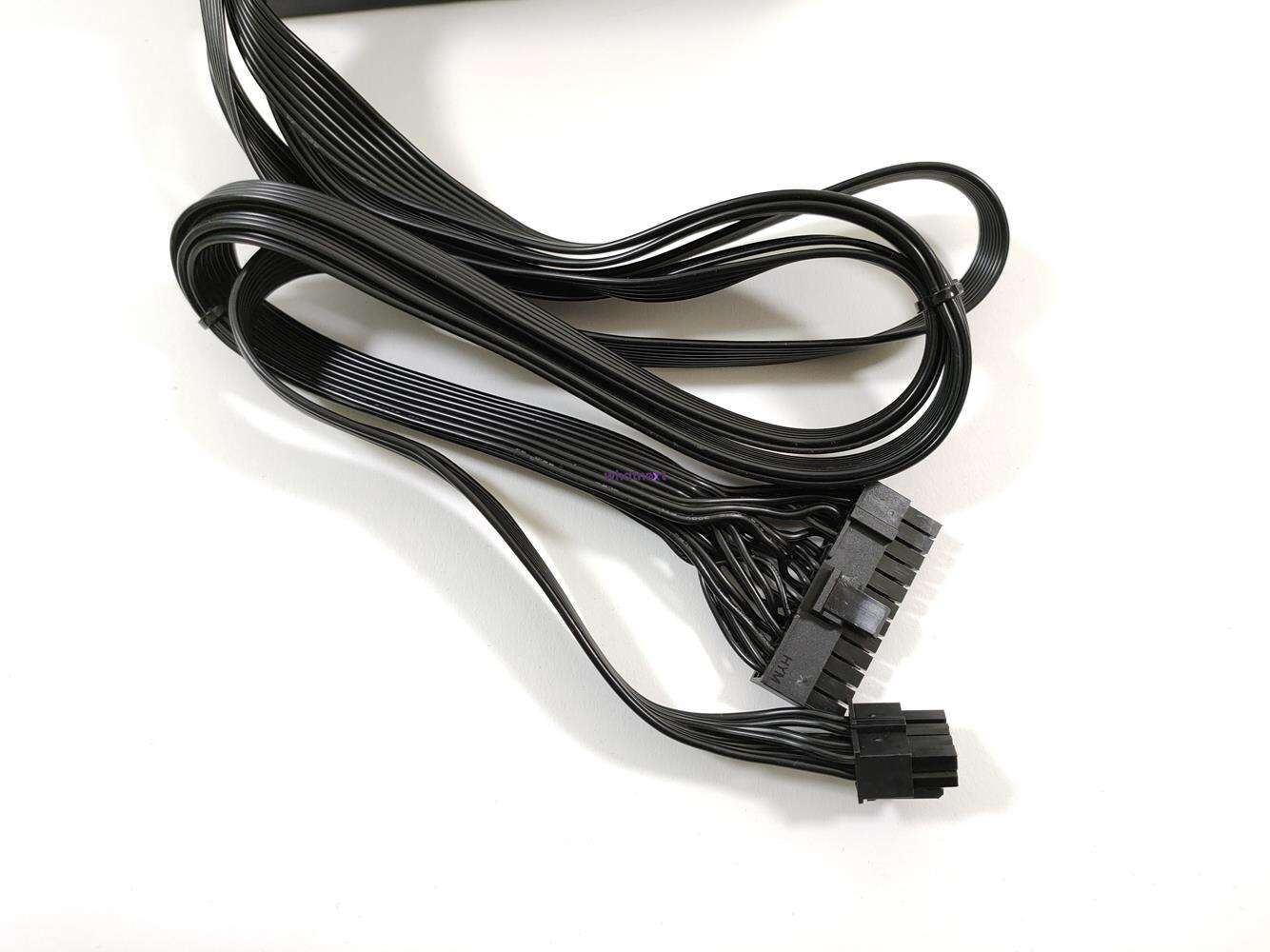 Zasilacz jest częściowo modularny. Bezpośrednio wychodzą dwa kable: ATX 24 pin (ok. 600 mm) oraz EPS 8 pin (ok. 600 mm). Wśród dodatkowych znajdziemy jeden 2x PCI-E 6+2 pin (ok. 500 mm do pierwszej wtyczki, odległość pomiędzy kolejnymi wynosi ok. 150 mm), jeden 2x SATA + Molex (ok. 450 mm do pierwszej wtyczki, odległość pomiędzy kolejnymi wynosi ok. 150 mm), jeden 2x SATA + 2x Molex (ok. 450 mm do pierwszej wtyczki, odległość pomiędzy kolejnymi wynosi ok. 150 mm) i jeden 2x SATA + Molex + FDD (ok. 450 mm do pierwszej wtyczki, odległość pomiędzy kolejnymi wynosi ok. 150 mm). Plusem na pewno są mieszane wiązki, które czasami mogą okazać się niezastąpione. Całe okablowanie ma też płaski profil, więc nie będzie problemów z ładnym jego ułożeniem w obudowie. Sama ilość wtyczek spokojnie wystarczy do zbudowania komputera, którego utrzyma zasilacz. Nie ma więc co tutaj narzekać na brak dwóch EPS czy większej ilości PCI-E.