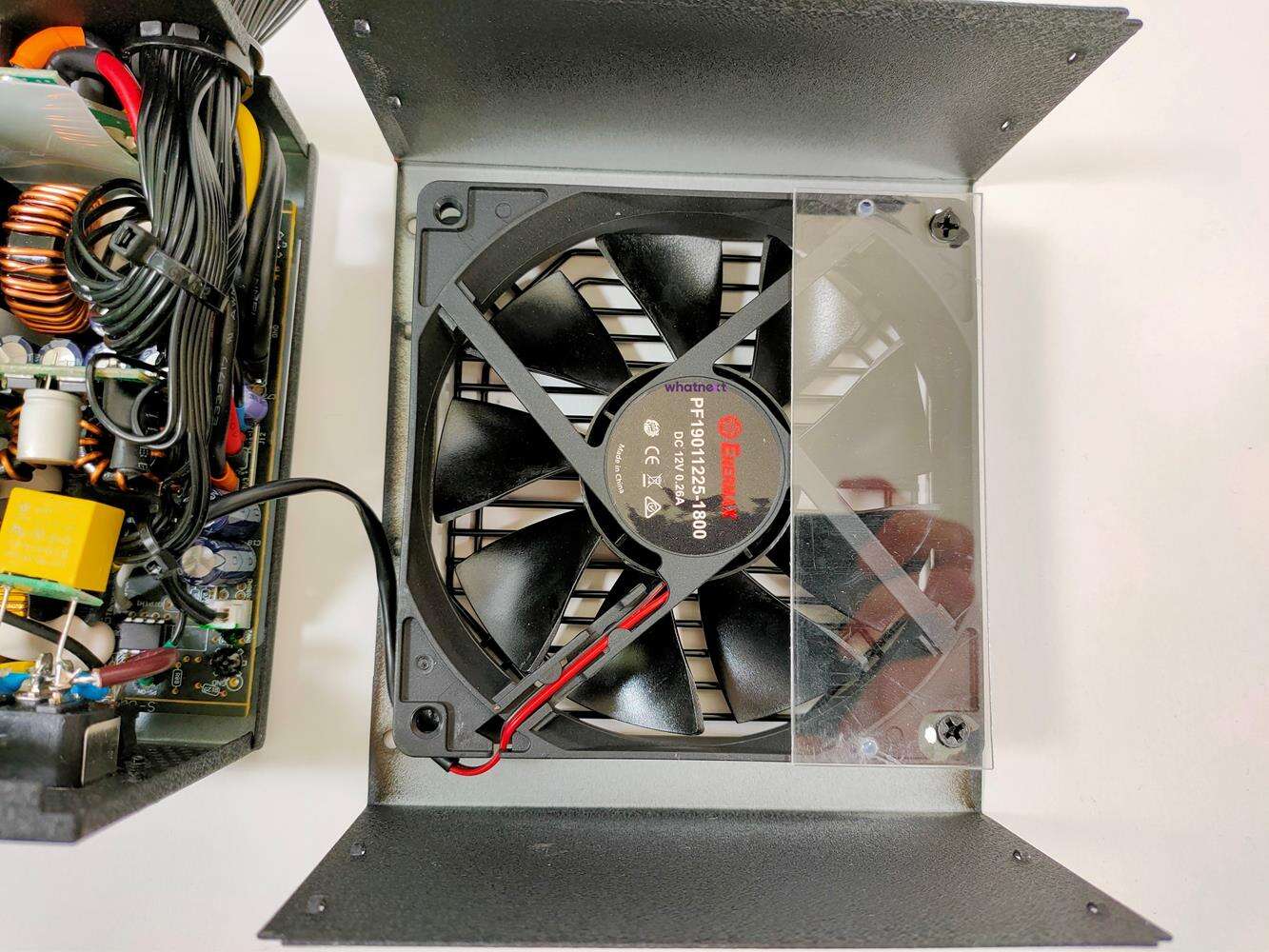 Za chłodzenie odpowiada 120 mm wentylator PF19011225-1800. Producent deklaruje maksymalną głośność równą 25,2 dBA oraz minimalną 14,7 dBA. Powinien więc on zbytnio nie przeszkadzać nawet przy maksymalnym obciążeniu.
